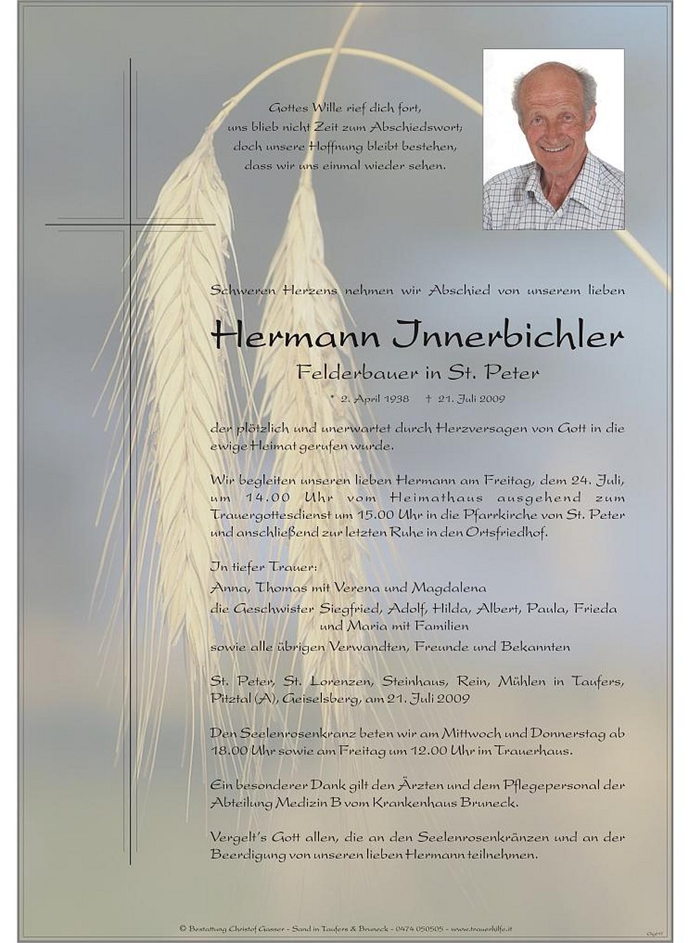Wir begleiten unseren lieben Hermann am Freitag, dem 24. Juli, um 14.00 Uhr vom Heimathaus ausgehend zum Trauergottesdienst um 15.00 Uhr in die Pfarrkirche von St. Peter und anschließend zur letzten Ruhe in den Ortsfriedhof.
