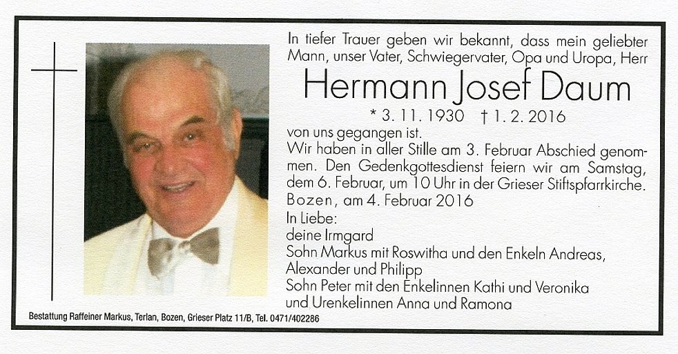 Den Gedenkgottesdienst feiern wir am Samstag, den 6. Februar, um 10 Uhr in der Grieser Stiftspfarrkirche.