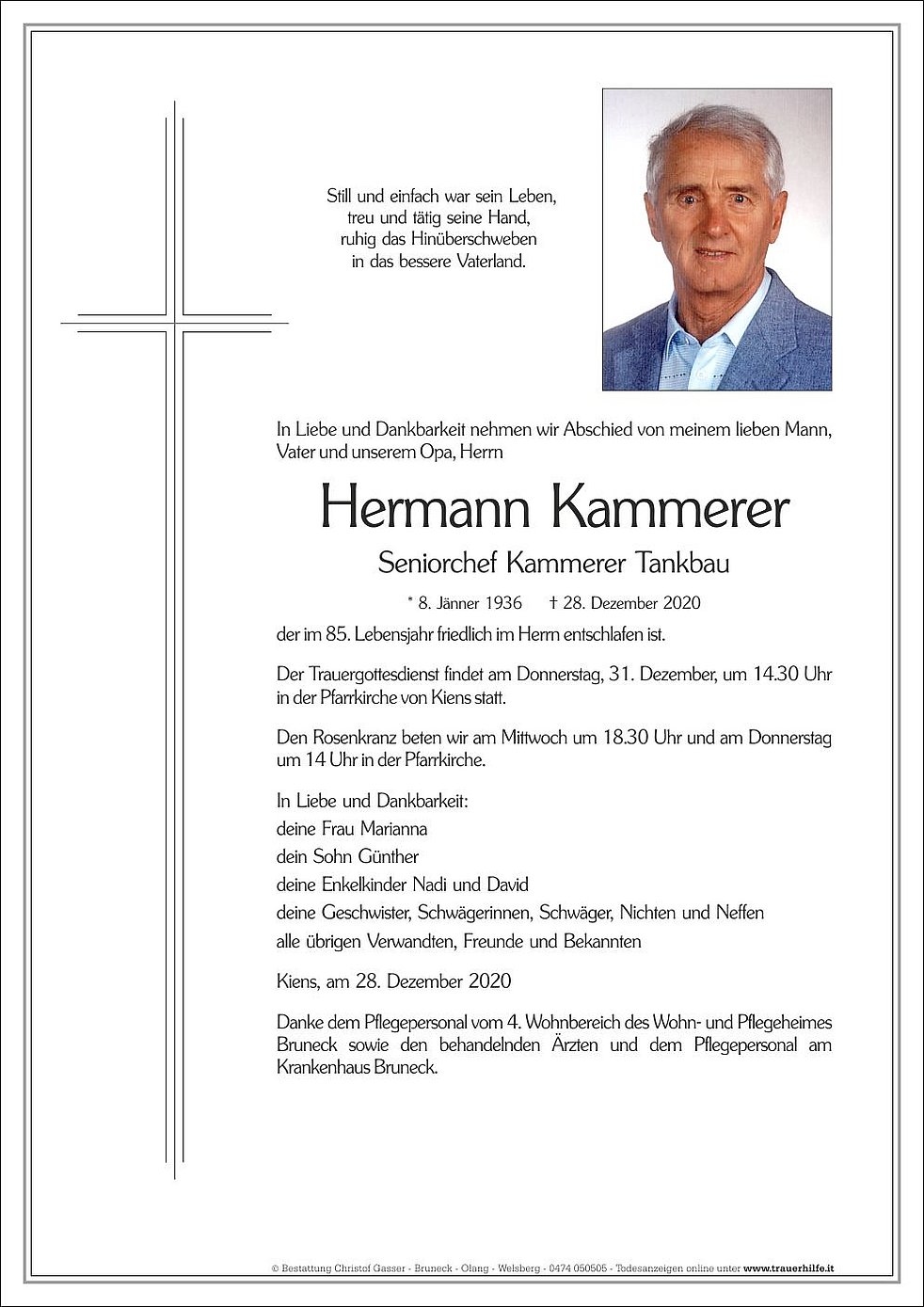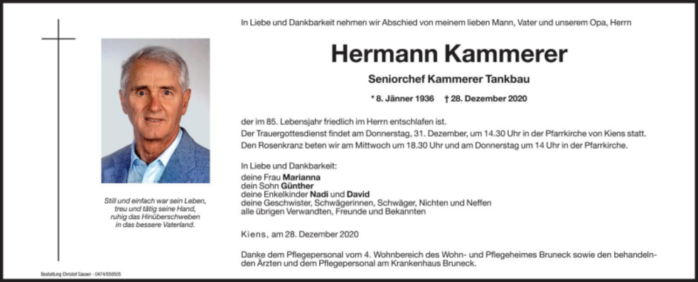 Der Trauergottesdienst findet am Donnerstag, 31. Dezember, um 14.30 Uhr in der Pfarrkirche von Kiens statt.