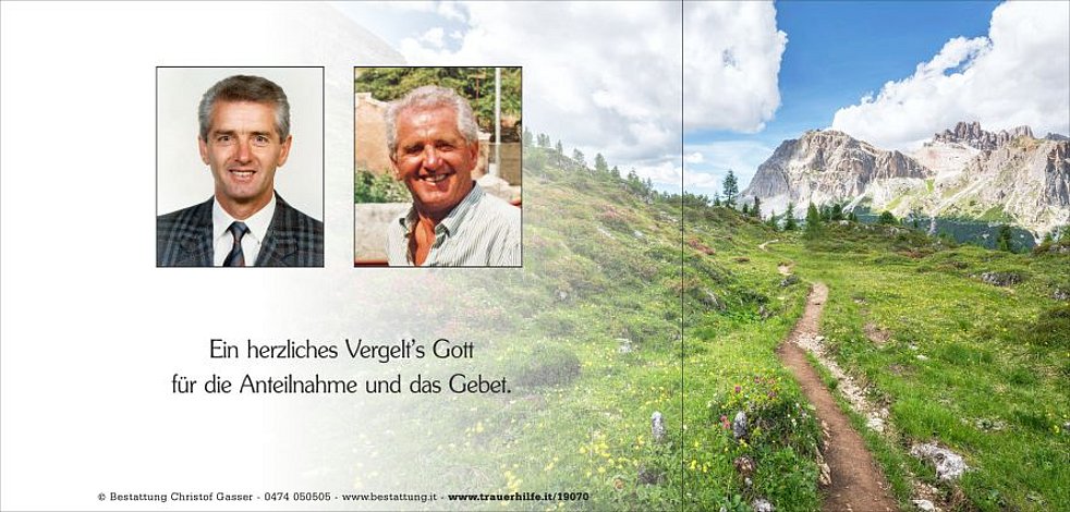 Danke dem Pflegepersonal vom 4. Wohnbereich des Wohn- und Pflegeheimes Bruneck sowie den behandelnden Ärzten und dem Pflegepersonal am Krankenhaus Bruneck.
