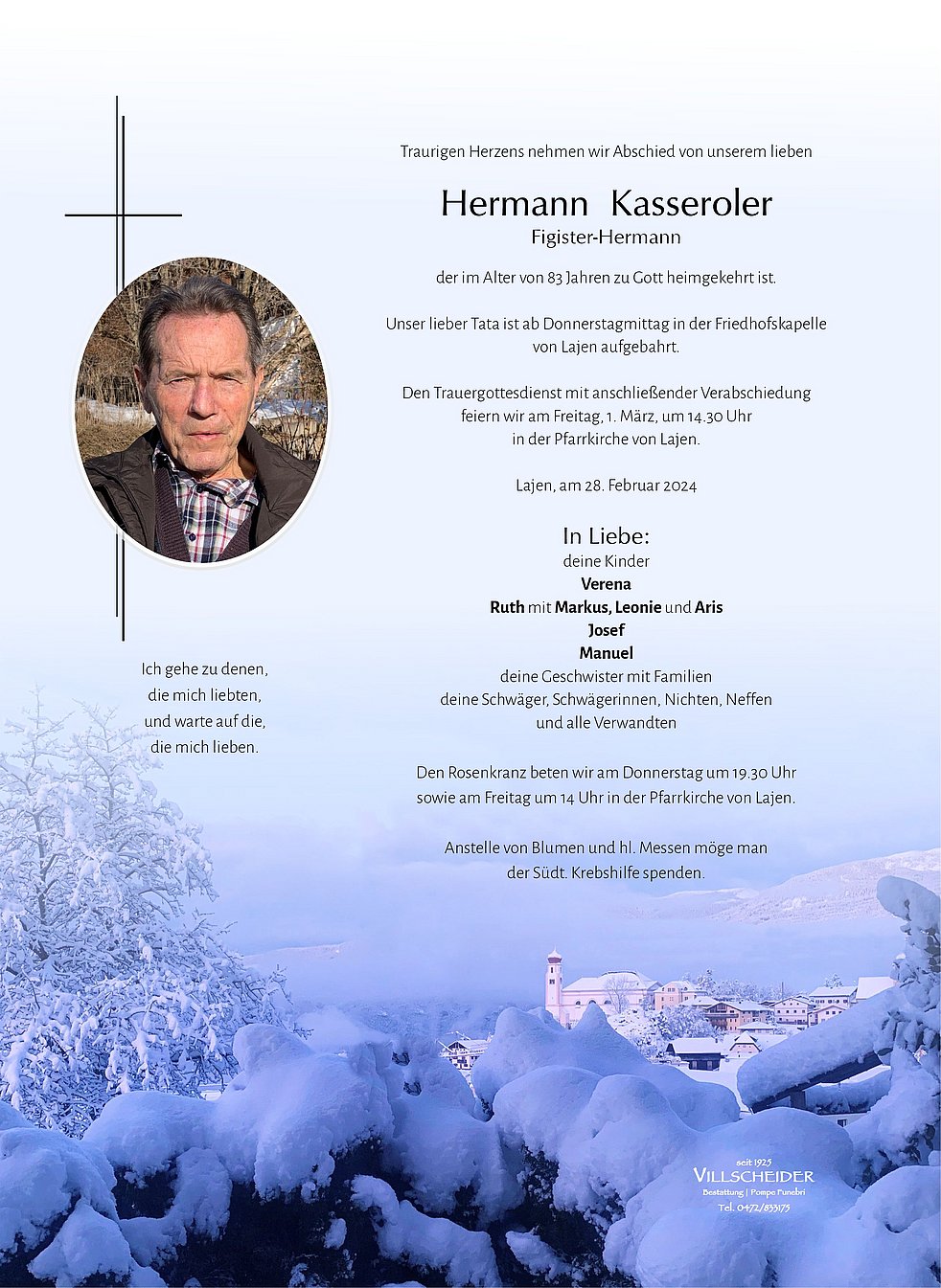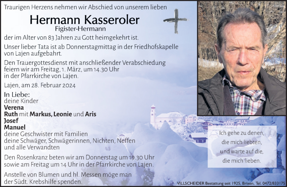 Begräbnisgottesdienst: 01.03. - 14:30 Uhr Lajen
