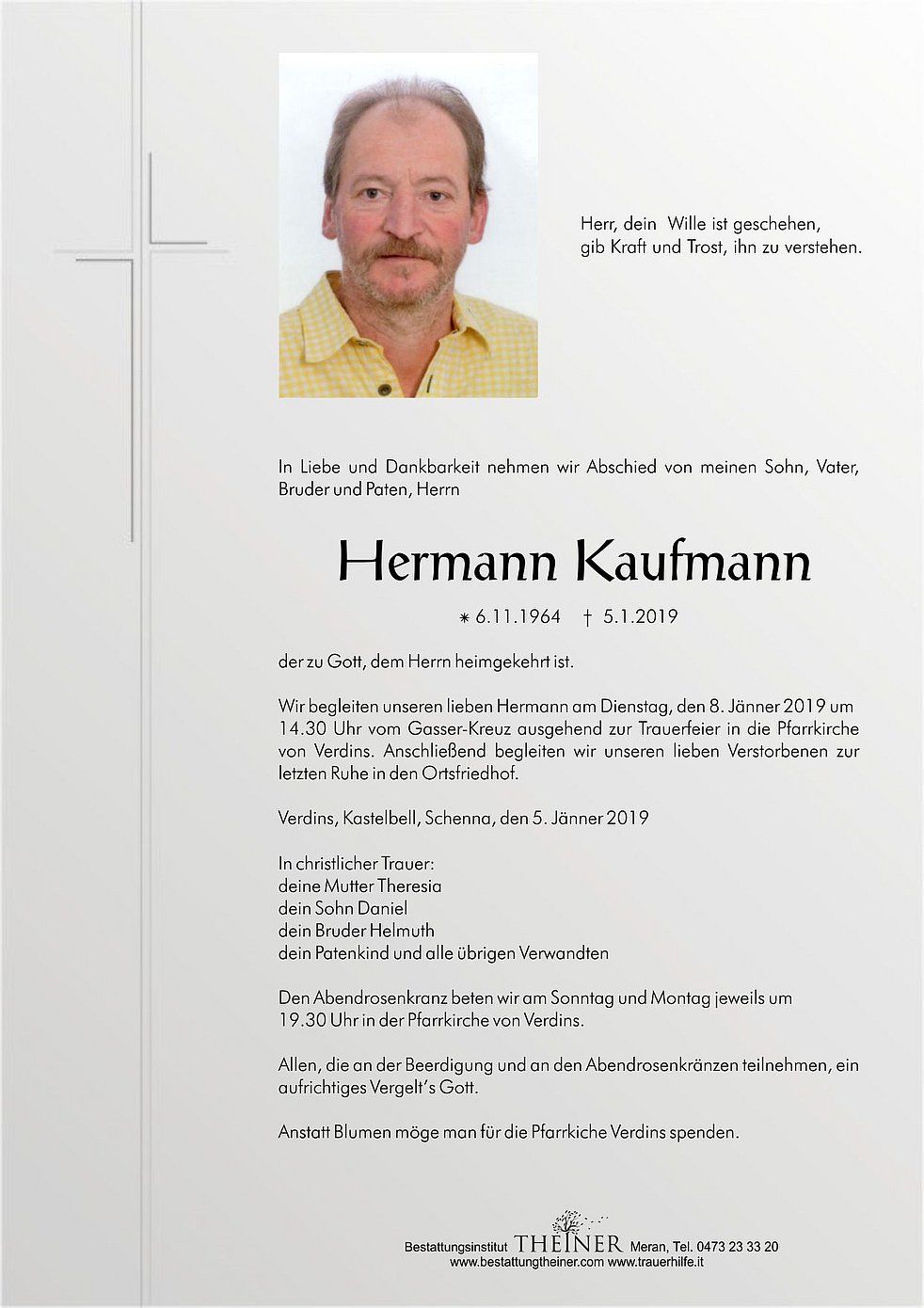 Wir begleiten unseren lieben Hermann am Dienstag, den 8. Jänner 2019 um 14.30 Uhr vom Gasser-Kreuz ausgehend zur Trauerfeier in die Pfarrkirche von Verdins. Anschließend begleiten wir unseren lieben Verstorbenen zur letzten Ruhe in den Ortsfriedhof.