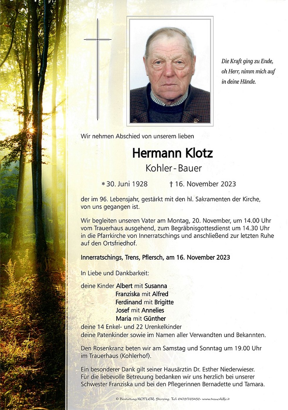Wir begleiten unseren Vater am Montag, 20. November, um 14.00 Uhr vom Trauerhaus ausgehend, zum Begräbnisgottesdienst um 14.30 Uhr in die Pfarrkirche von Innerratschings und anschließend zur letzten Ruhe auf den Ortsfriedhof.