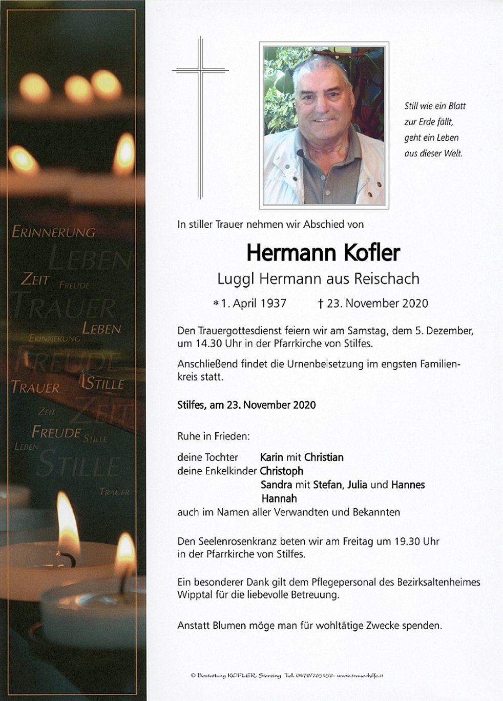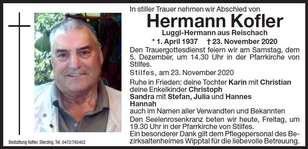 Den Trauergottesdienst feiern wir am Samstag, dem 5. Dezember, um 14.30 Uhr in der Pfarrkirche von Stilfes.