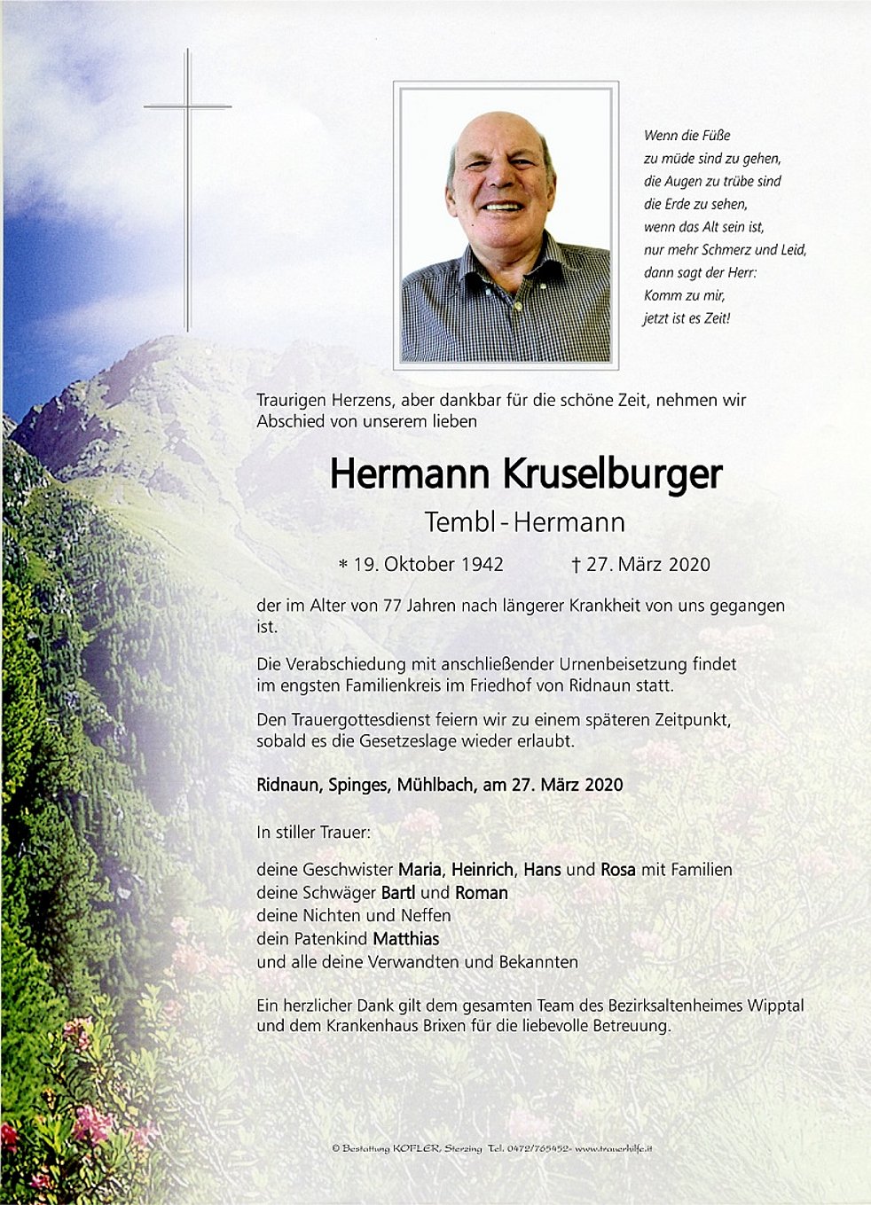 Die Verabschiedung mit anschließender Urnenbeisetzung findet im engsten Familienkreis im Friedhof von Ridnaun statt.