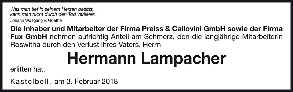 Auf Wunsch des Verstorbenen möge man statt Blumen, für wohltätige Zwecke spenden.