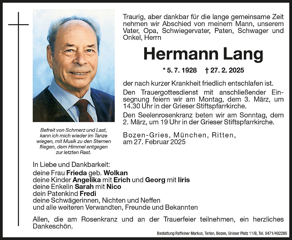 Den Trauergottesdienst mit anschließender Einsegnung feiern wir am Montag, dem 3. März, um 14.30 Uhr in der Grieser Stiftspfarrkirche.