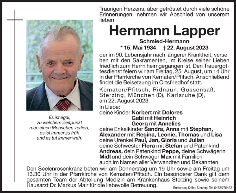 Den Trauergottesdienst feiern wir am Freitag, 25. August, um 14.00 Uhr in der Pfarrkirche von Kematen/Pfitsch. Anschließend findet die Beisetzung im Ortsfriedhof statt.