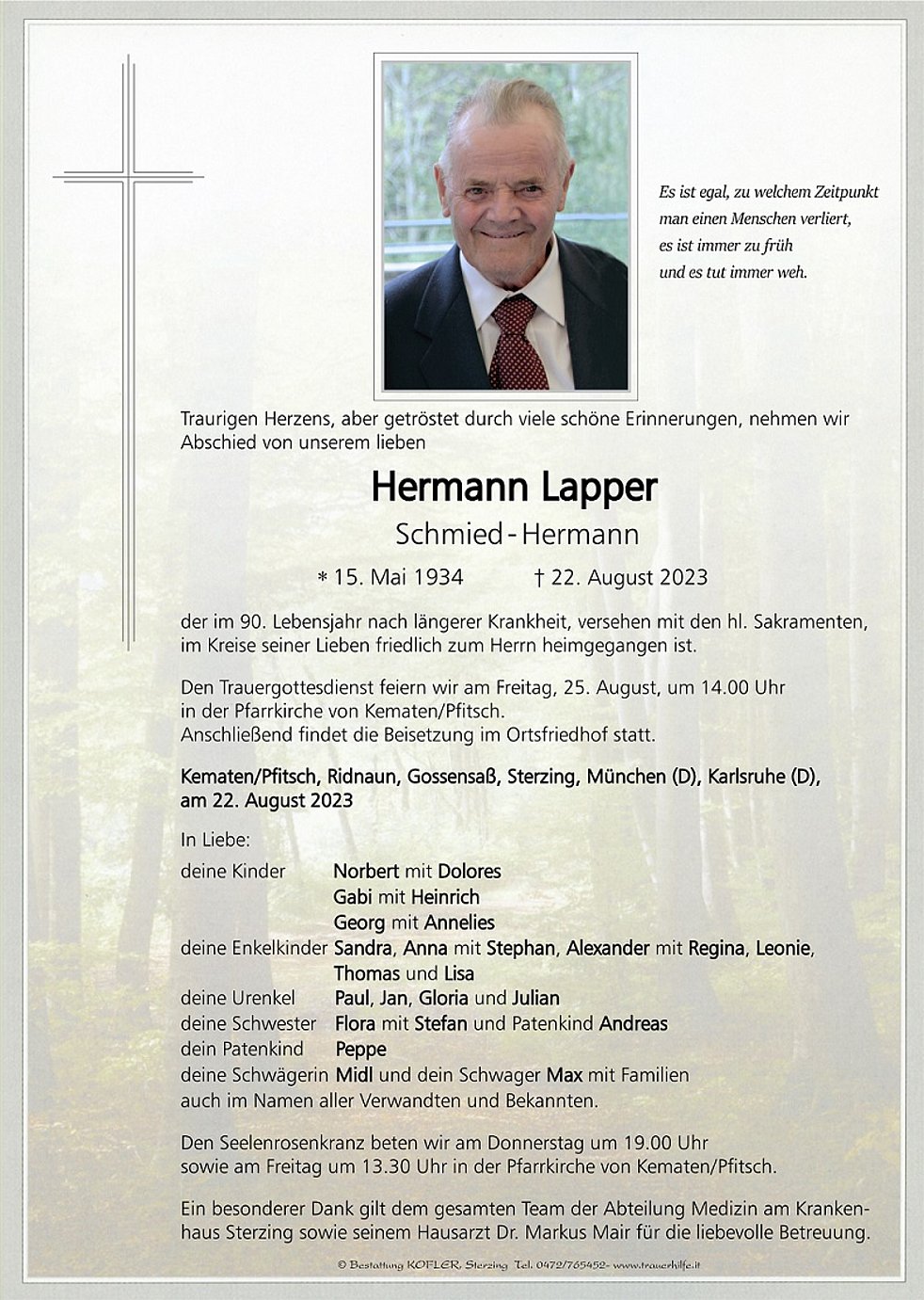 der im 90. Lebensjahr nach längerer Krankheit, versehen mit den hl. Sakramenten, im Kreise seiner Lieben friedlich zum Herrn heimgegangen ist.