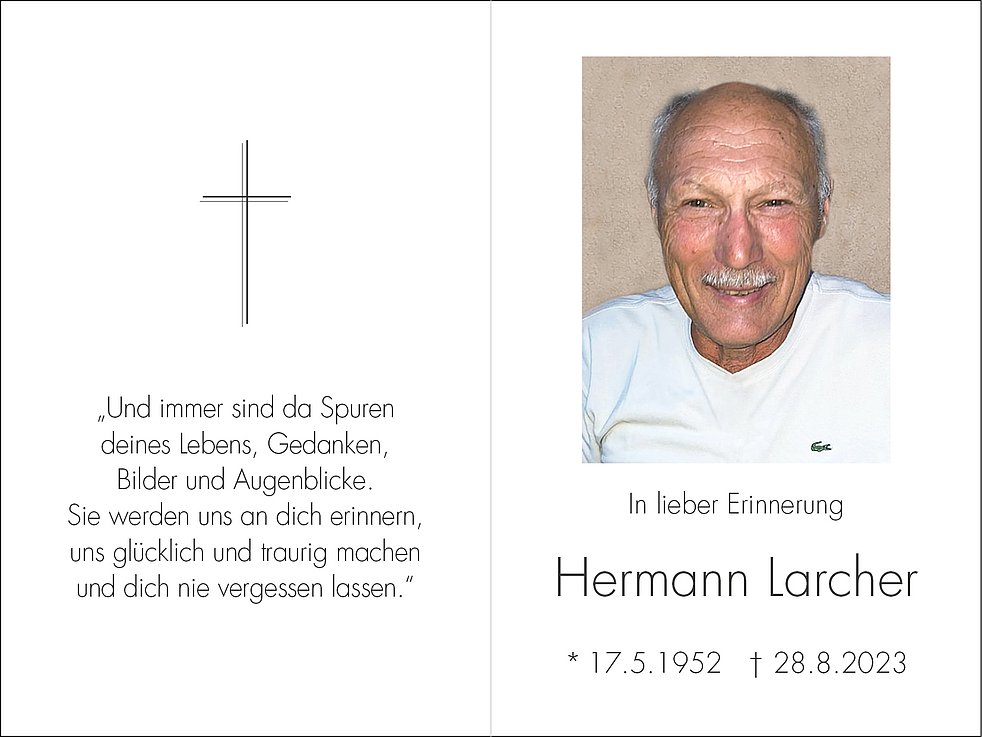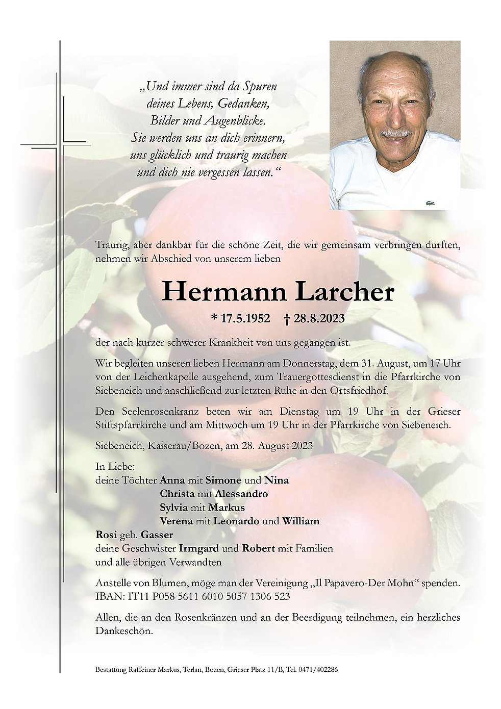 Wir begleiten unseren lieben Hermann am Donnerstag, dem 31. August, um 17 Uhr von der Leichenkapelle ausgehend, zum Trauergottesdienst in die Pfarrkirche von Siebeneich und anschließend zur letzten Ruhe in den Ortsfriedhof.