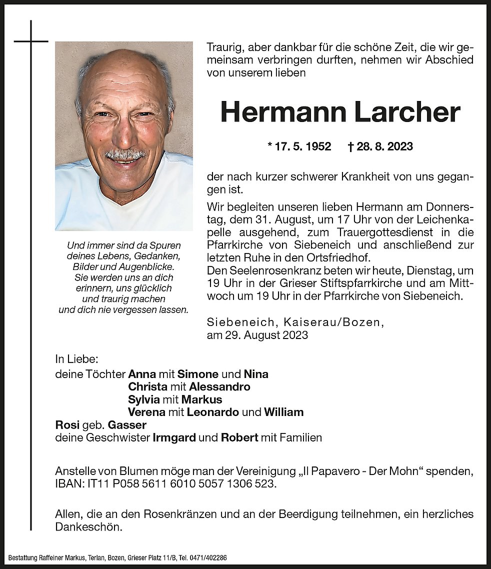 Anstelle von Blumen, möge man der Vereinigung „Il Papavero-Der Mohn“ spenden.