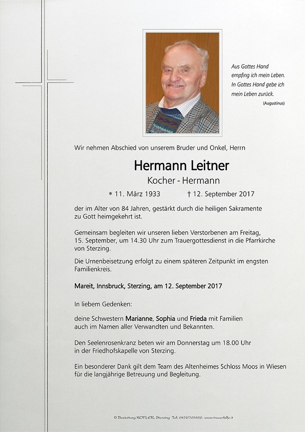 Gemeinsam begleiten wir unseren lieben Verstorbenen am Freitag, 15. September, um 14.30 Uhr zum Trauergottesdienst in die Pfarrkirche von Sterzing.