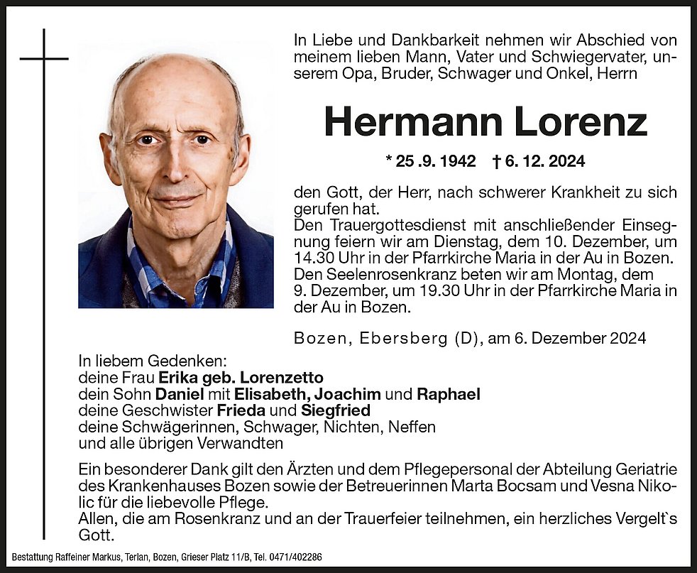 Den Trauergottesdienst mit anschließender Einsegnung feiern wir am Dienstag, dem 10. Dezember, um 14.30 Uhr in der Pfarrkirche Maria in der Au in Bozen.