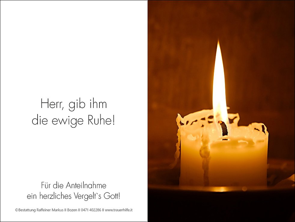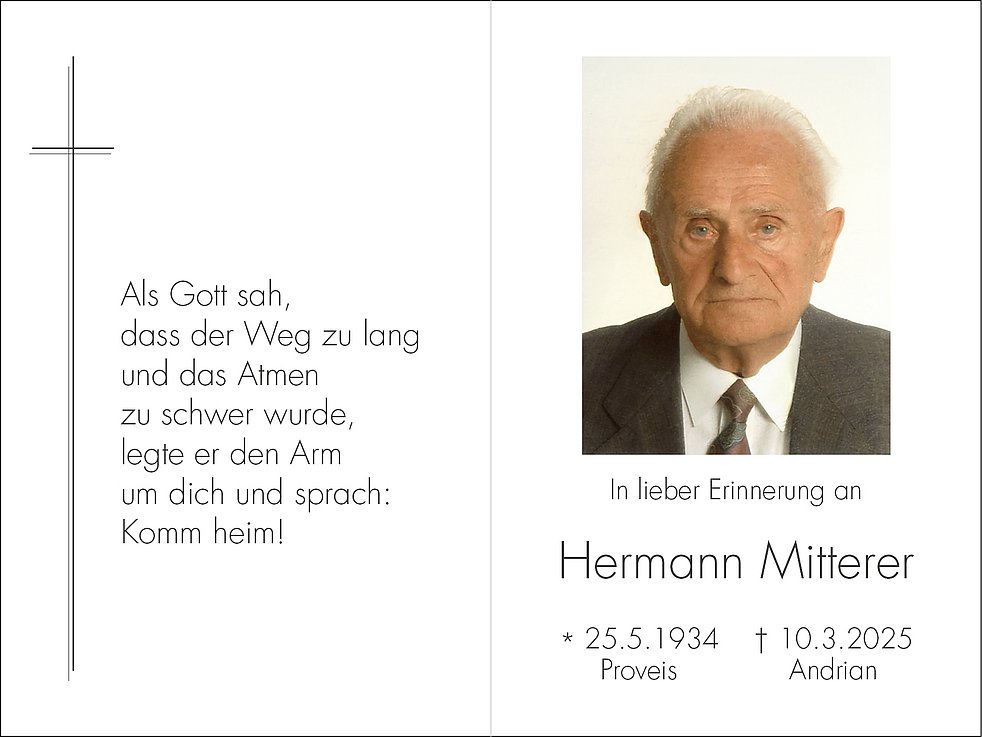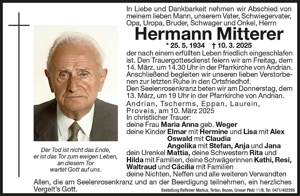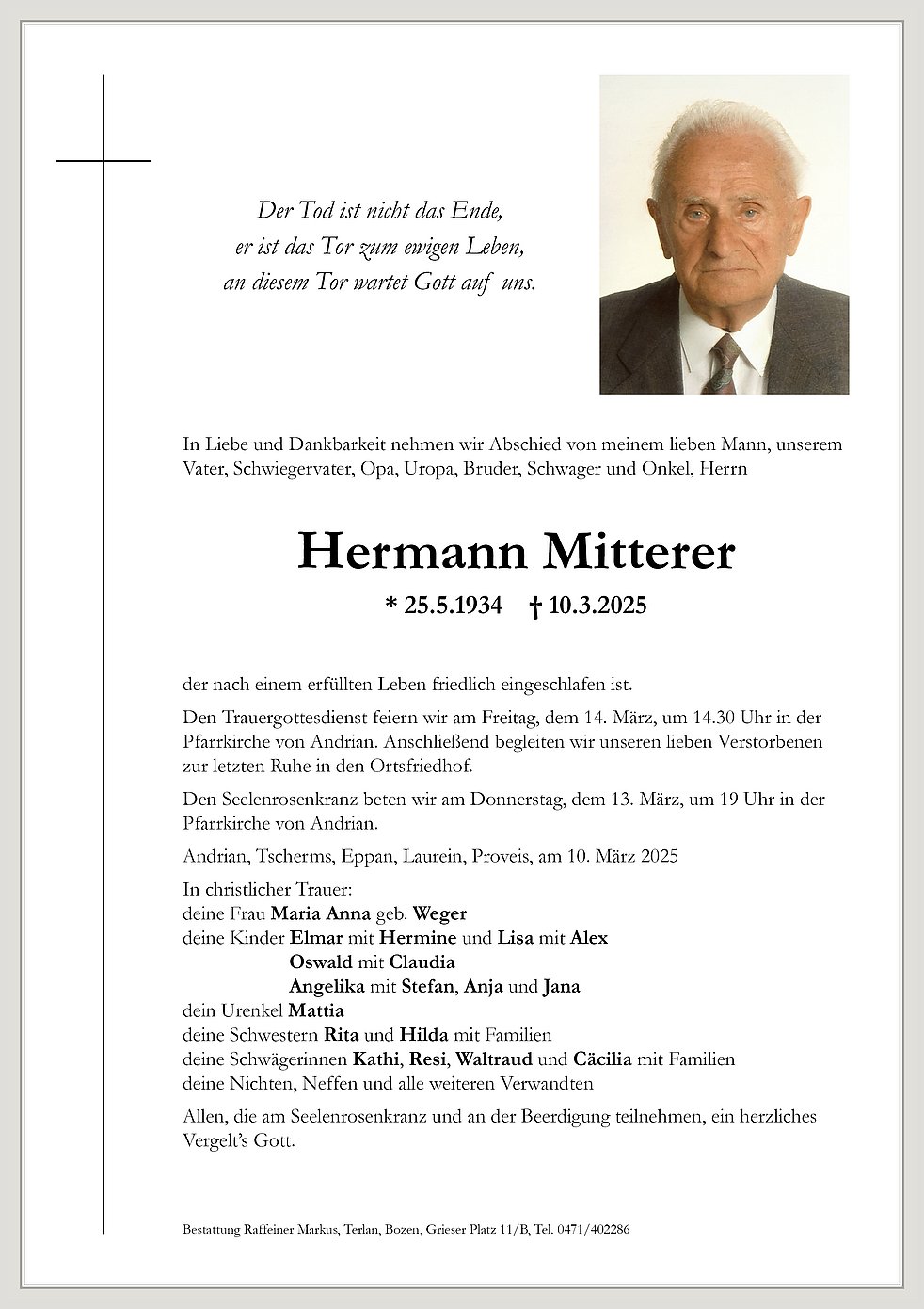 Den Trauergottesdienst feiern wir am Freitag, dem 14. März, um 14.30 Uhr in der Pfarrkirche von Andrian. Anschließend begleiten wir unseren lieben Verstorbenen zur letzten Ruhe in den Ortsfriedhof.