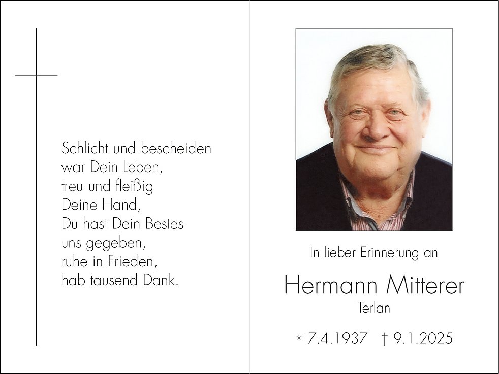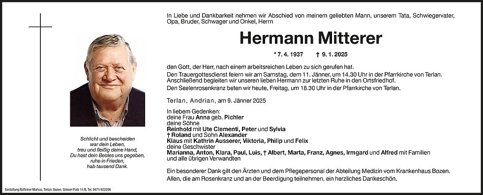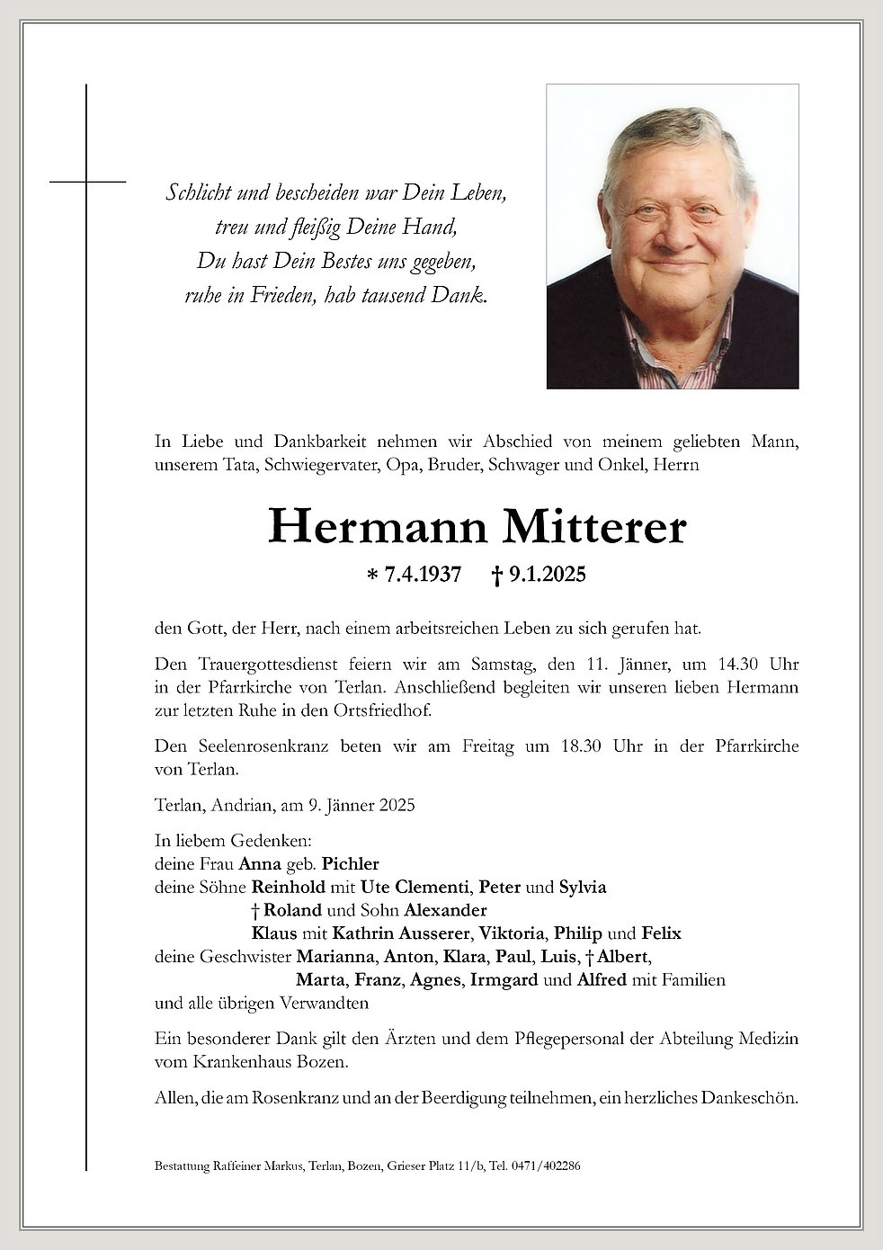 Den Trauergottesdienst feiern wir am Samstag, den 11. Jänner, um 14.30 Uhr in der Pfarrkirche von Terlan. Anschließend begleiten wir unseren lieben Hermann zur letzten Ruhe in den Ortsfriedhof.