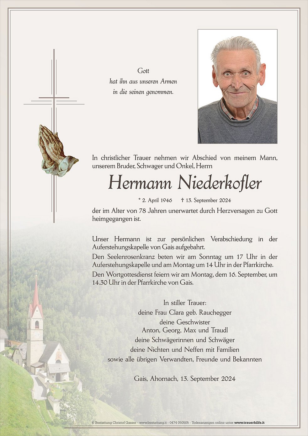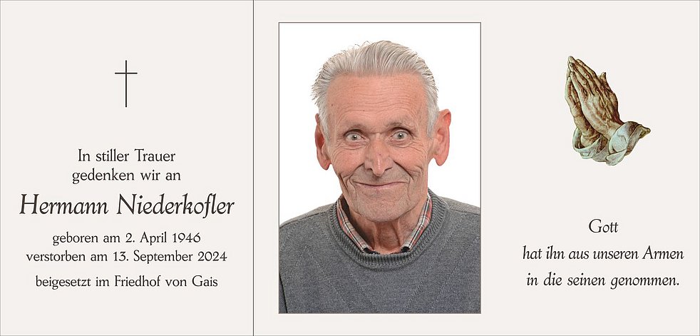 Unser Hermann ist zur persönlichen Verabschiedung in der Auferstehungskapelle von Gais aufgebahrt.