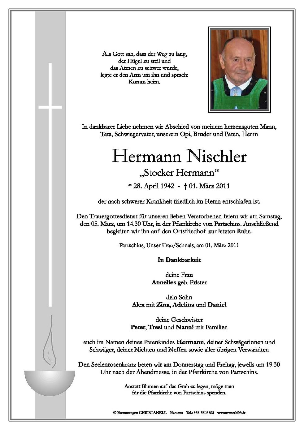 Anstatt Blumen auf das Grab zu legen, möge man für die Pfarrkirche von Partschins spenden.