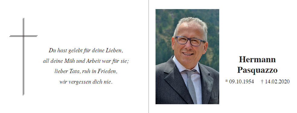 Wir begleiten unseren lieben Tata am Montag, dem 17. Februar, um 14.00 Uhr vom Trauerhaus ausgehend, zum Gottesdienst um 14.30 Uhr in der St. Josefs-Kirche von Runggaditsch und anschließend zur letzten Ruhe in den Ortsfriedhof.