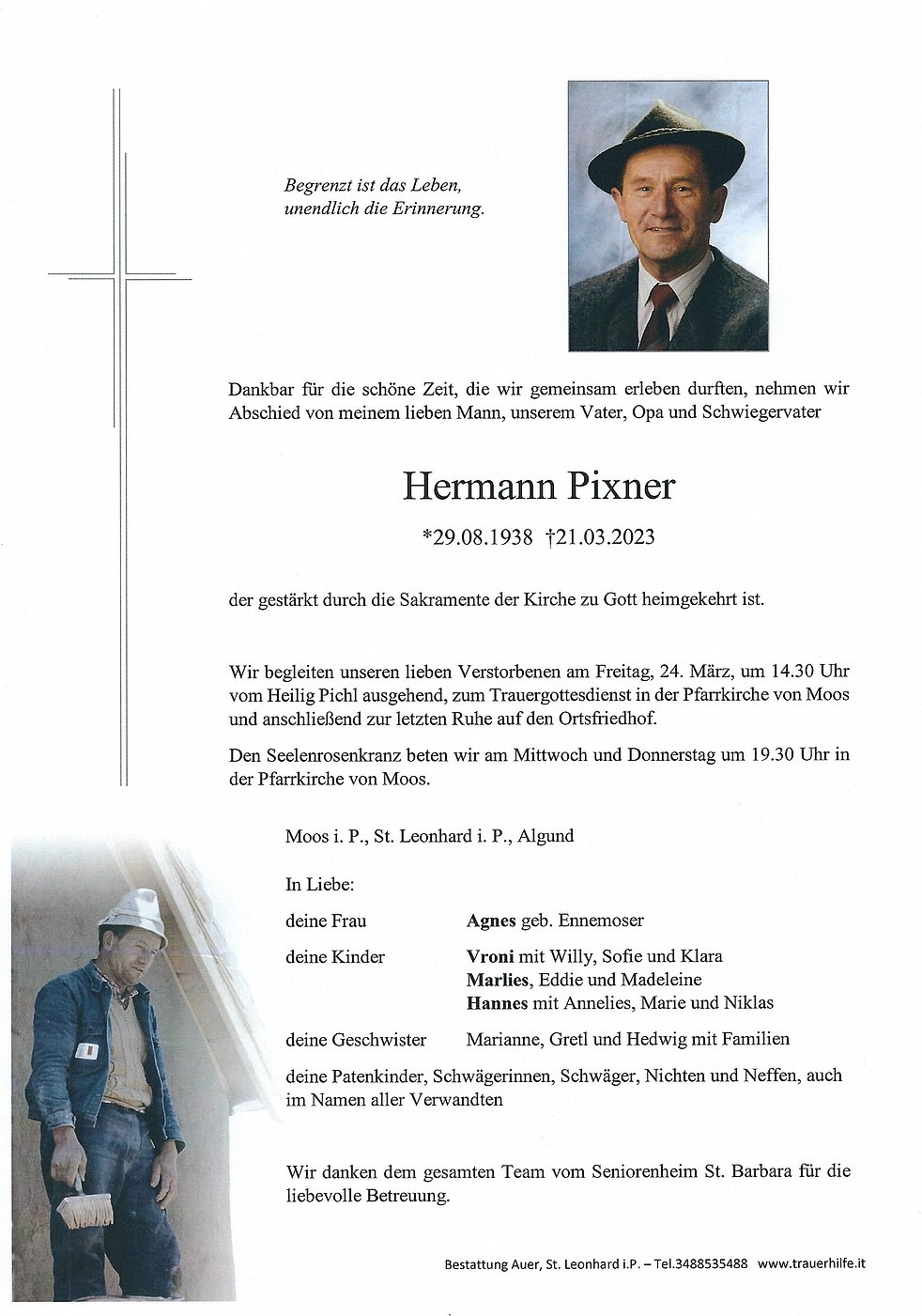 Wir begleiten unseren lieben Verstorbenen am Freitag, 24. März, um 14.30 Uhr vom Heilig Pichl ausgehend, zum Trauergottesdienst in der Pfarrkirche von Moos und anschließend zur letzten Ruhe auf den Ortsfriedhof.