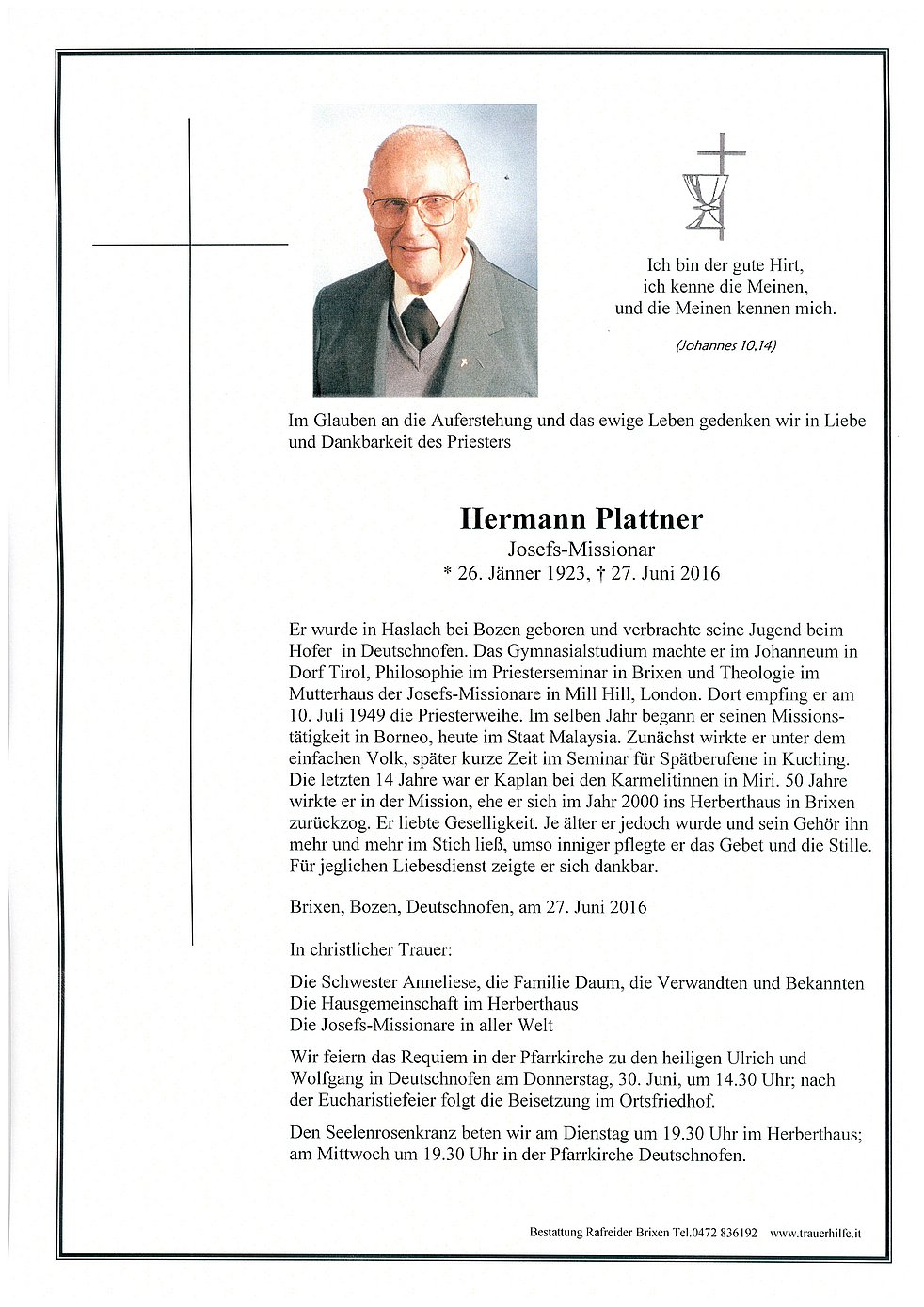 Er wurde in Haslach bei Bozen geboren und verbrachte seine Jugend beim Hofer in Deutschnofen. Das Gymnasialstudium machte er im Johanneum in Dorf Tirol, Philosophie im Priesterseminar in Brixen und Theologie im Mutterhaus der Josefs-Missionare in Mill Hill, London. Dort empfing er am 10. Juli 1949 die Priesterweihe. Im selben Jahr begann er seinen Missions- tätigkeit in Borneo, heute im Staat Malaysia. Zunächst wirkte er unter dem einfachen Volk, später kurze Zeit im Seminar für Spätberufene in Kuching. Die letzten 14 Jahre war er Kaplan bei den Karmelitinnen in Miri. 50 Jahre wirkte er in der Mission, ehe er sich im Jahr 2000 ins Herberthaus in Brixen zurückzog. Er liebte Geselligkeit. Je älter er jedoch wurde und sein Gehör ihn mehr und mehr im Stich ließ, umso inniger pflegte er das Gebet und die Stille. Für jeglichen Liebesdienst zeigte er sich dankbar.