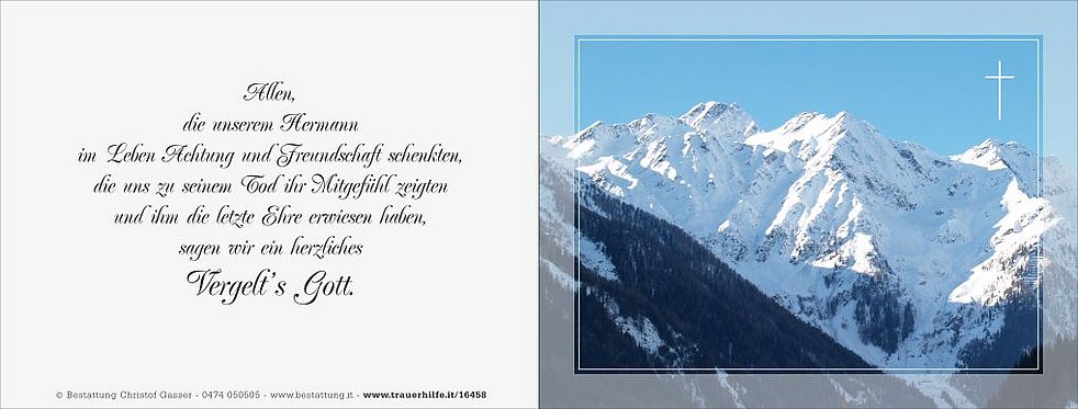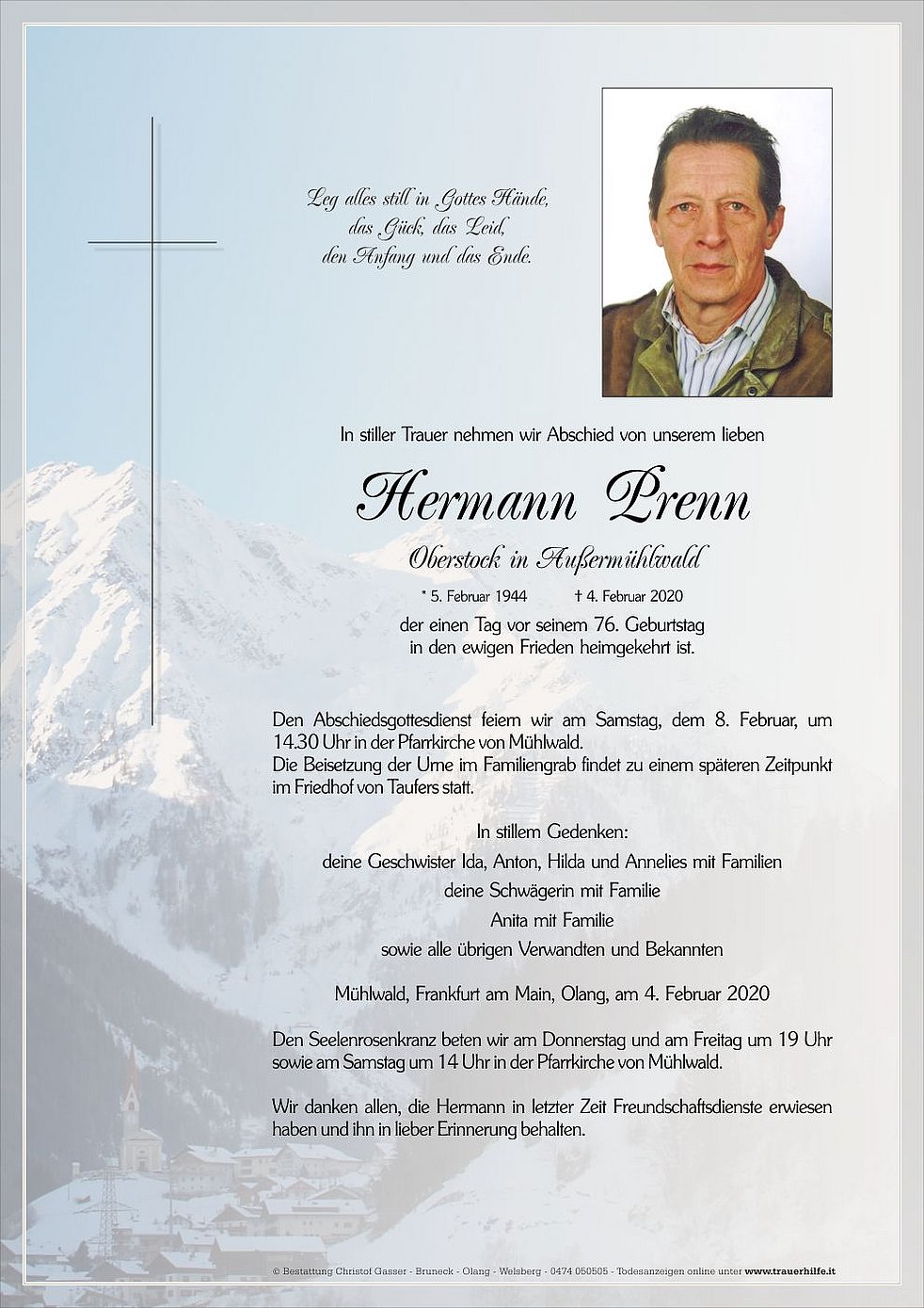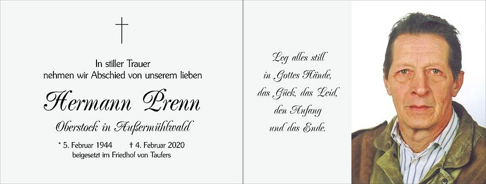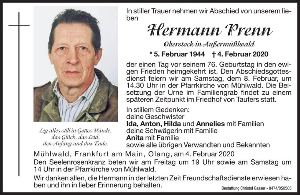 Den Abschiedsgottesdienst feiern wir am Samstag, dem 8. Februar, um 14.30 Uhr in der Pfarrkirche von Mühlwald. Die Beisetzung der Urne im Familiengrab findet zu einem späteren Zeitpunkt im Friedhof von Taufers statt.