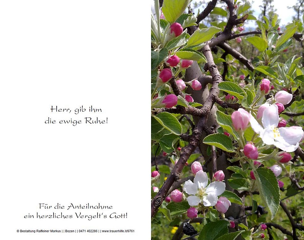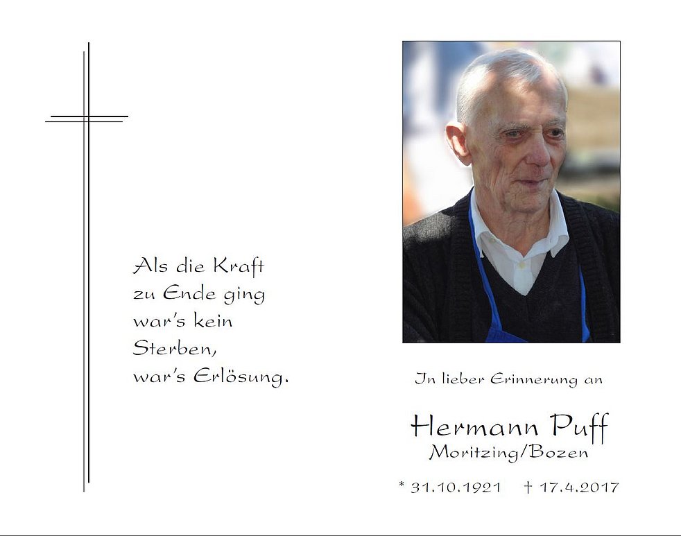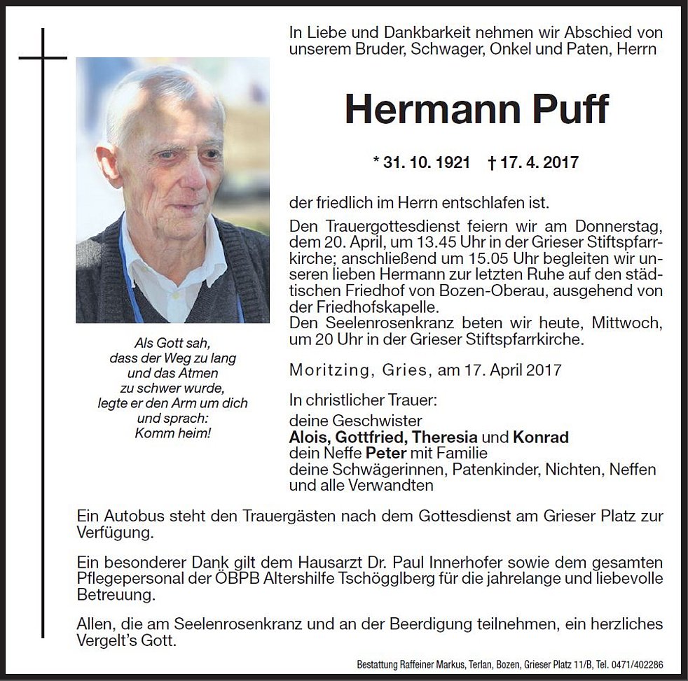 Den Trauergottesdienst feiern wir am Donnerstag, den 20. April, um 13.45 Uhr in der Grieser Stiftspfarrkirche; anschlieβend um 15.05 Uhr begleiten wir unseren lieben Hermann zur letzten Ruhe auf den städtischen Friedhof von Bozen-Oberau, ausgehend von der Friedhofskapelle.