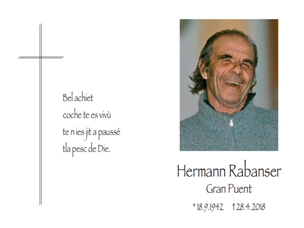 Den Trauergottesdienst für unseren lieben Hermann feiern wir am Montag, dem 30. April, um 14.30 Uhr im St. Anna-Kirchlein von St. Ulrich.