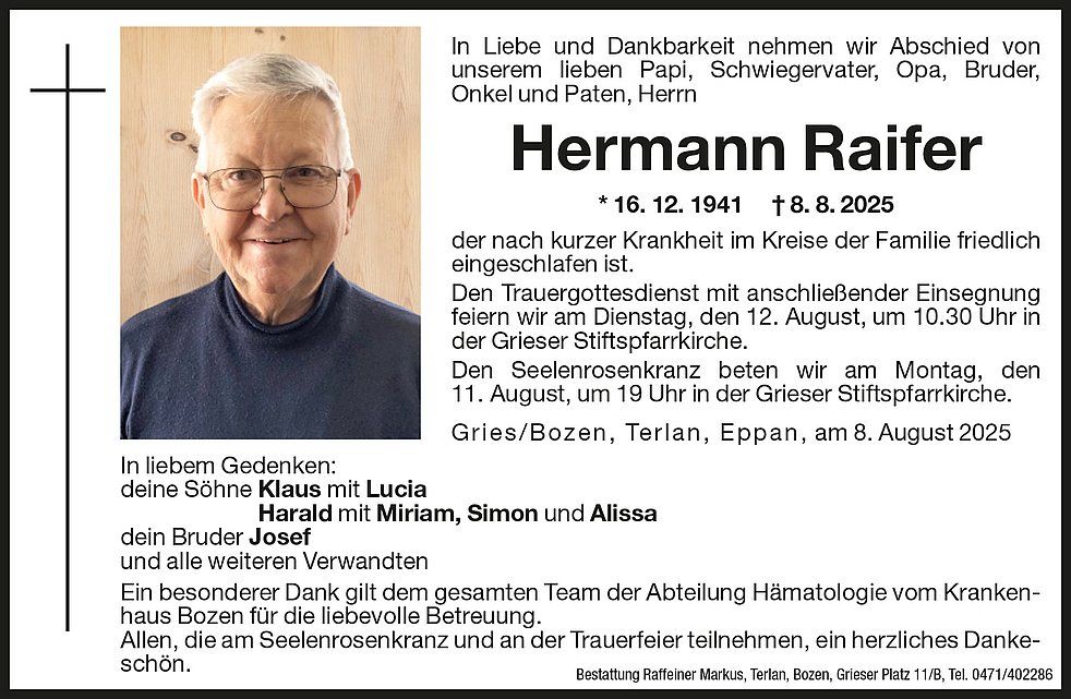 Den Trauergottesdienst mit anschließender Einsegnung feiern wir am Dienstag, den 12. August, um 10.30 Uhr in der Grieser Stiftspfarrkirche.