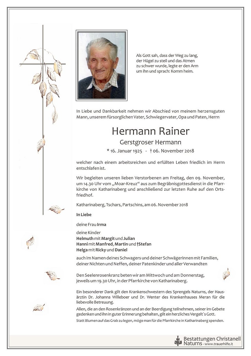 Wir begleiten unseren lieben Verstorbenen am Freitag, den 09. November, um 14.30 Uhr vom „Moar-Kreuz“ aus zum Begräbnisgottesdienst in die Pfarrkirche von Katharinaberg und anschließend zur letzten Ruhe auf den Ortsfriedhof.