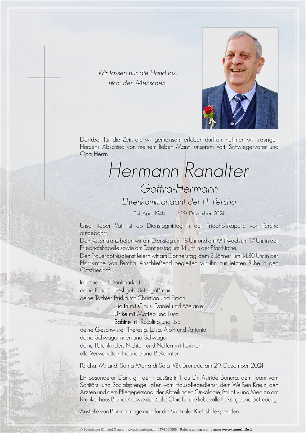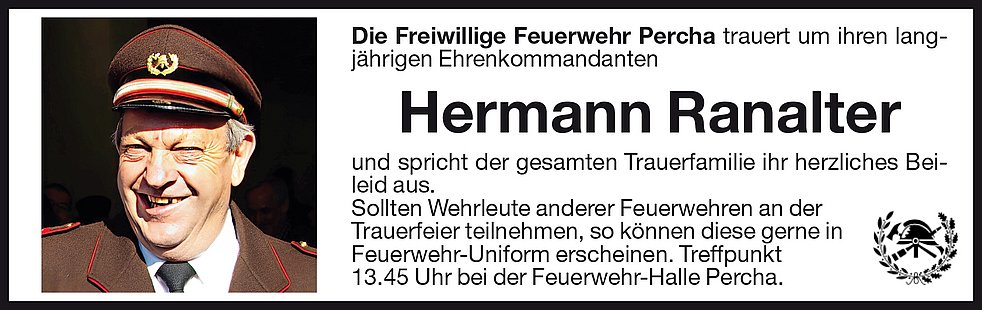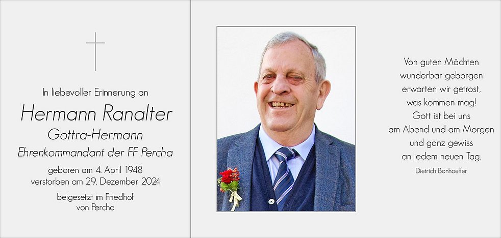 Den Trauergottesdienst feiern wir am Donnerstag, dem 2. Jänner, um 14.30 Uhr in der Pfarrkirche von Percha.