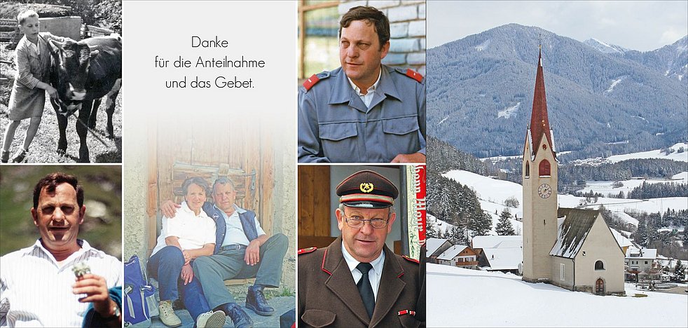 Ein besonderer Dank gilt der Hausärztin Frau Dr. Astride Bonura, dem Team vom Sanitäts- und Sozialsprengel, allen vom Hauspflegedienst, dem Weißen Kreuz, den Ärzten und dem Pflegepersonal der Abteilungen Onkologie, Palliativ und Medizin am Krankenhaus Bruneck sowie der Salus Clinic für die liebevolle Fürsorge und Betreuung.