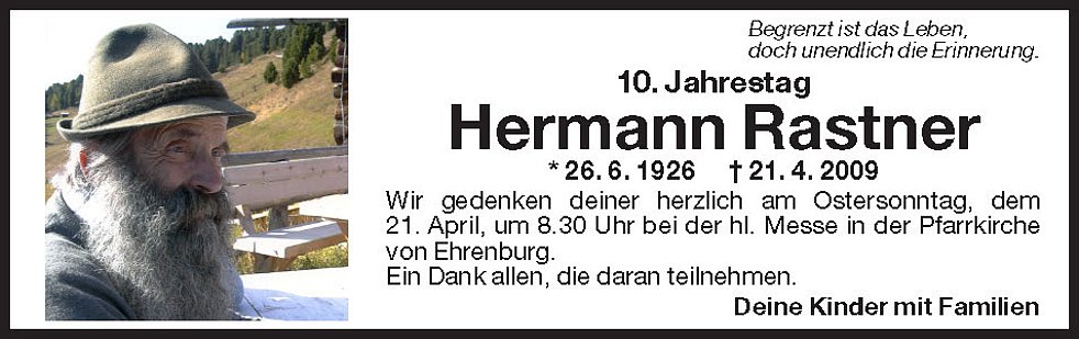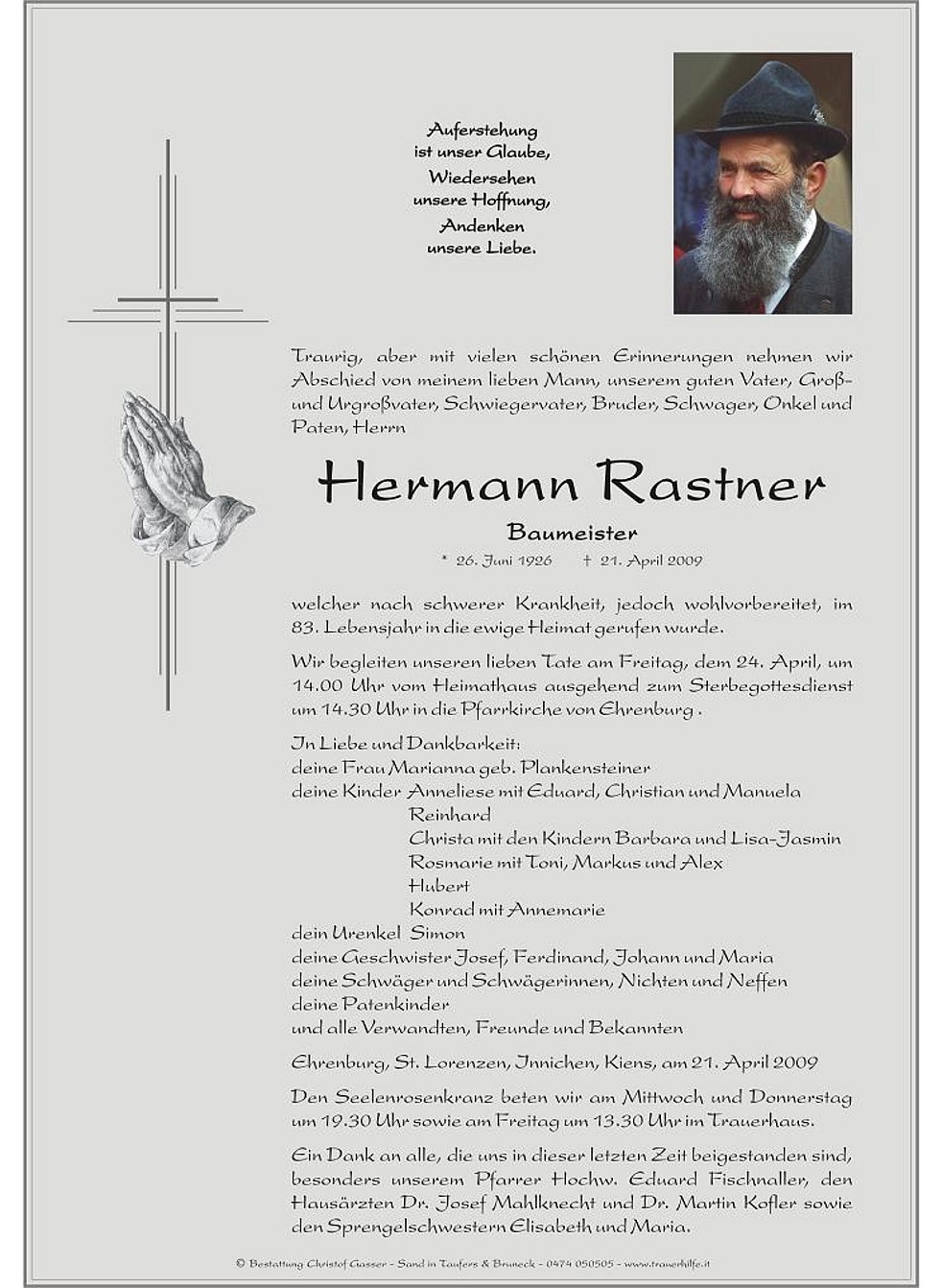 Ein Dank an alle, die uns in dieser letzten Zeit beigestanden sind, besonders unserem Pfarrer Hochw. Eduard Fischnaller, den Hausärzten Dr. Josef Mahlknecht und Dr. Martin Kofler sowie den Sprengelschwestern Elisabeth und Maria.