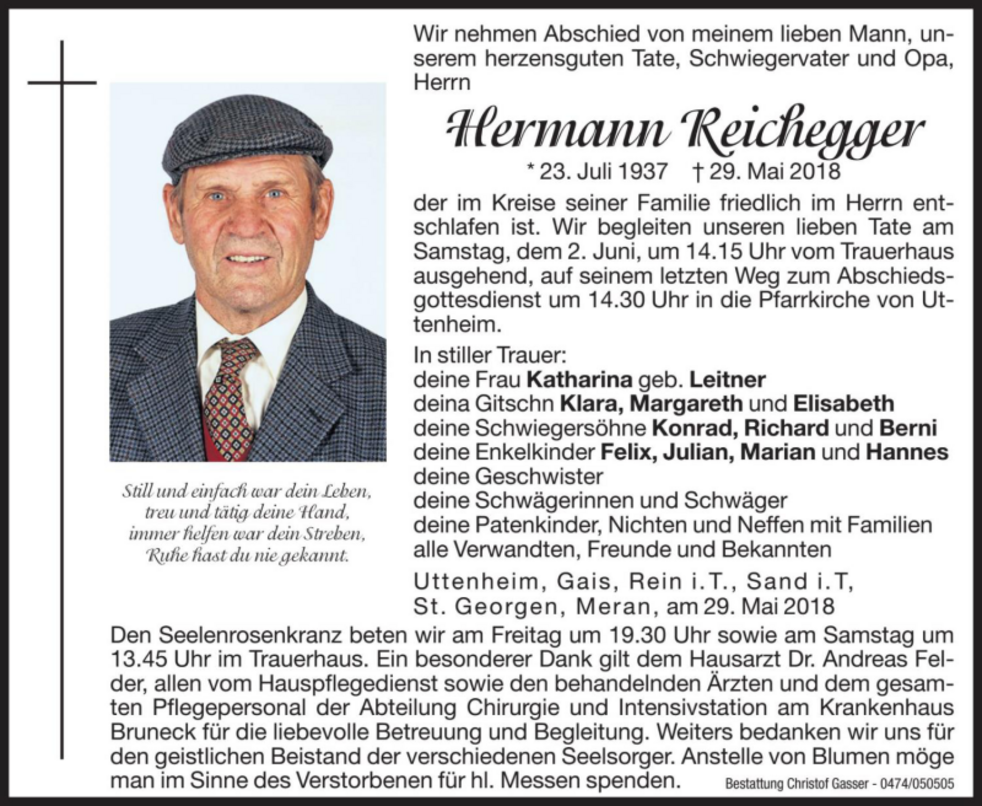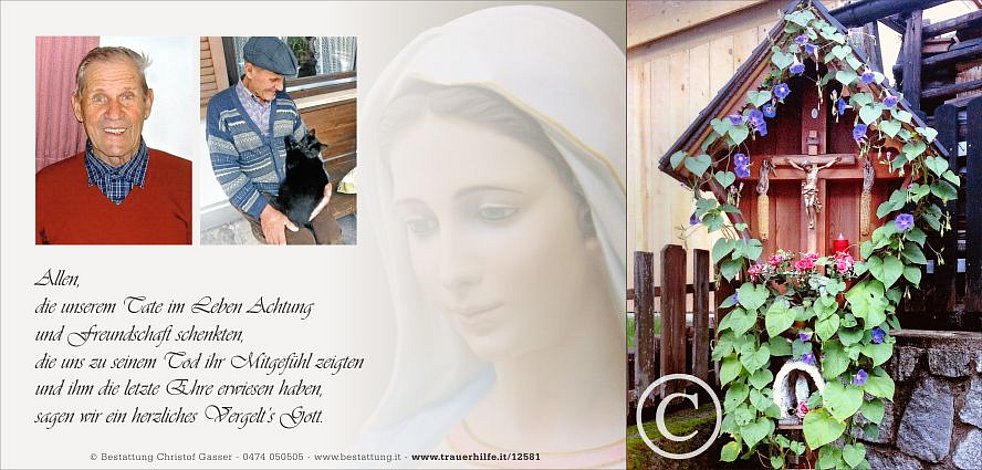 Ein besonderer Dank gilt dem Hausarzt Dr. Andreas Felder, allen vom Hauspflegedienst sowie den behandelnden Ärzten und dem gesamten Pflegepersonal der Abteilung Chirurgie und Intensivstation am Krankenhaus Bruneck für die liebevolle Betreuung und Begleitung.