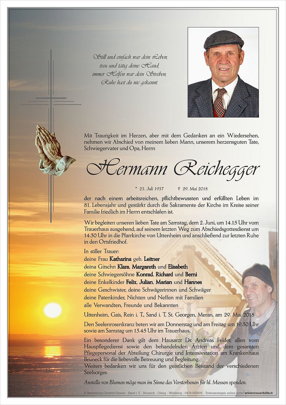 der nach einem arbeitsreichen, pflichtbewussten und erfüllten Leben im 81. Lebensjahr und gestärkt durch die Sakramente der Kirche im Kreise seiner Familie friedlich im Herrn entschlafen ist.