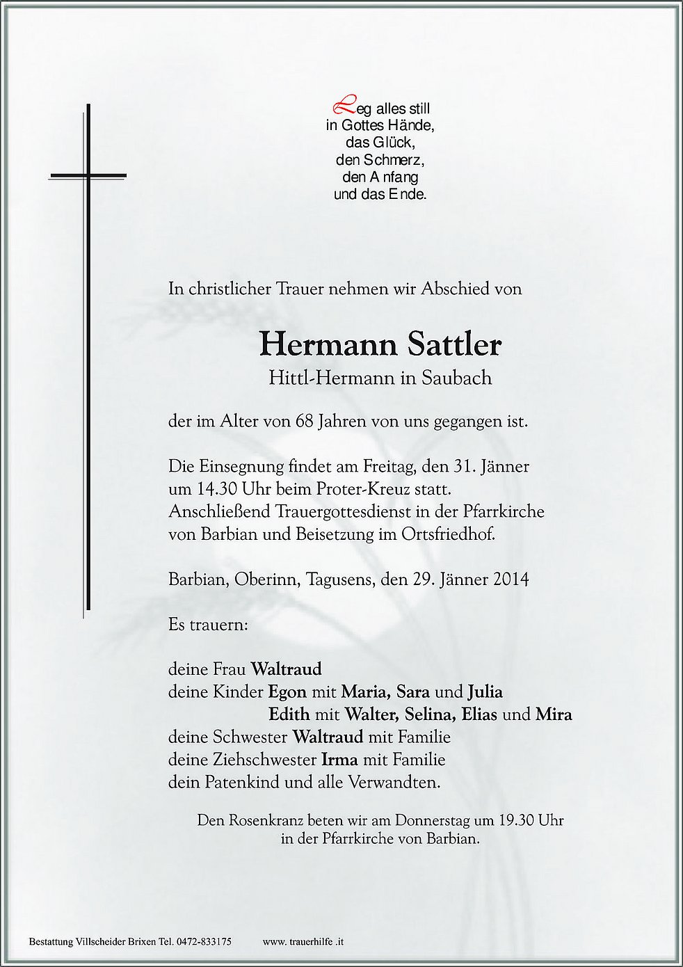 Die Einsegnung findet am Freitag, den 31. Jänner