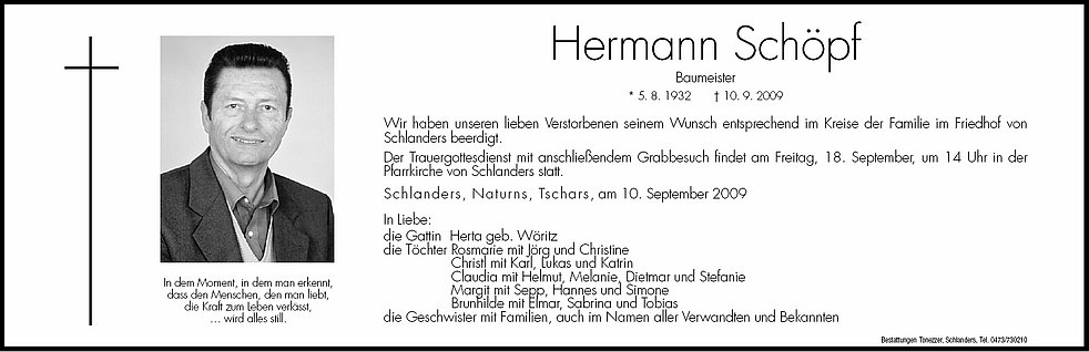 Wir haben unseren lieben Verstorbenen seinem Wunsch entsprechend im Kreise der Familie im Friedhof von Schlanders beerdigt.