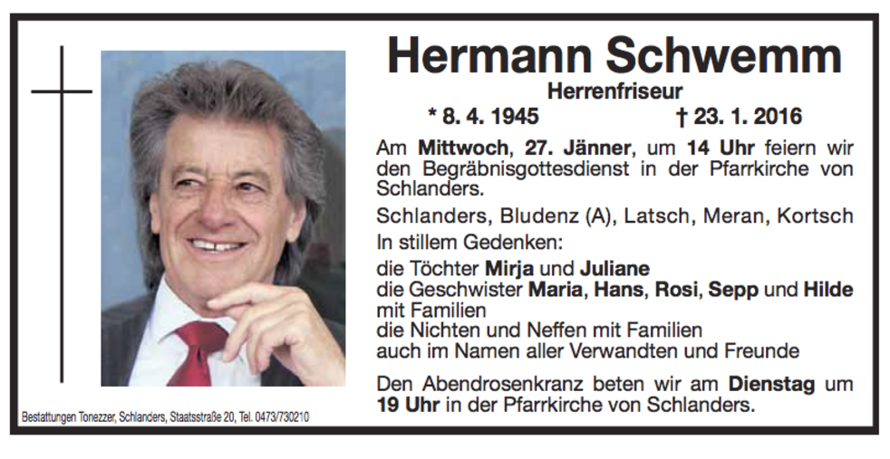 Am Mittwoch, 27. Jänner, um 14 Uhr feiern wir den Begräbnisgottesdienst in der Pfarrkirche von Schlanders.