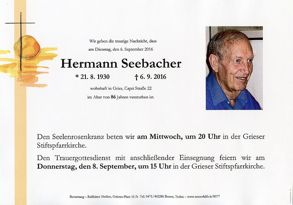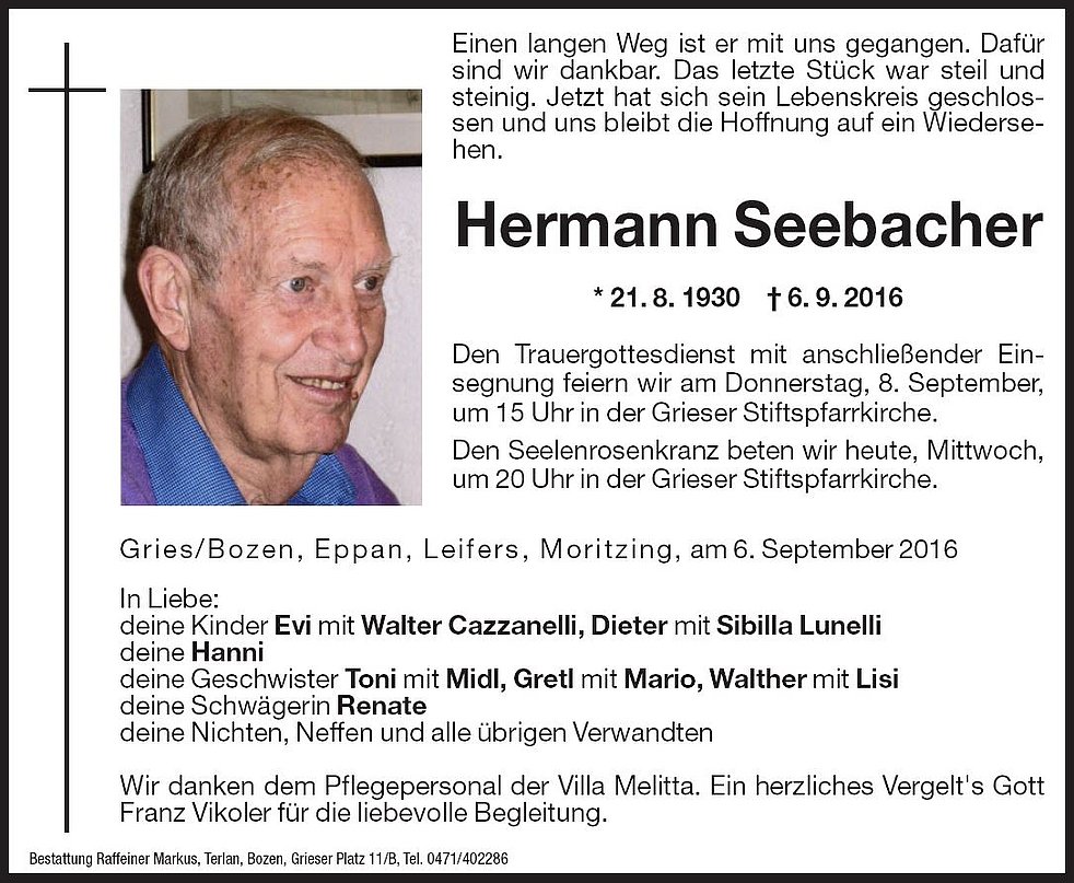 Den Trauergottesdienst mit anschlieβender Einsegnung feiern wir am Donnerstag, den 8. September, um 15 Uhr in der Grieser Stiftspfarrkirche.