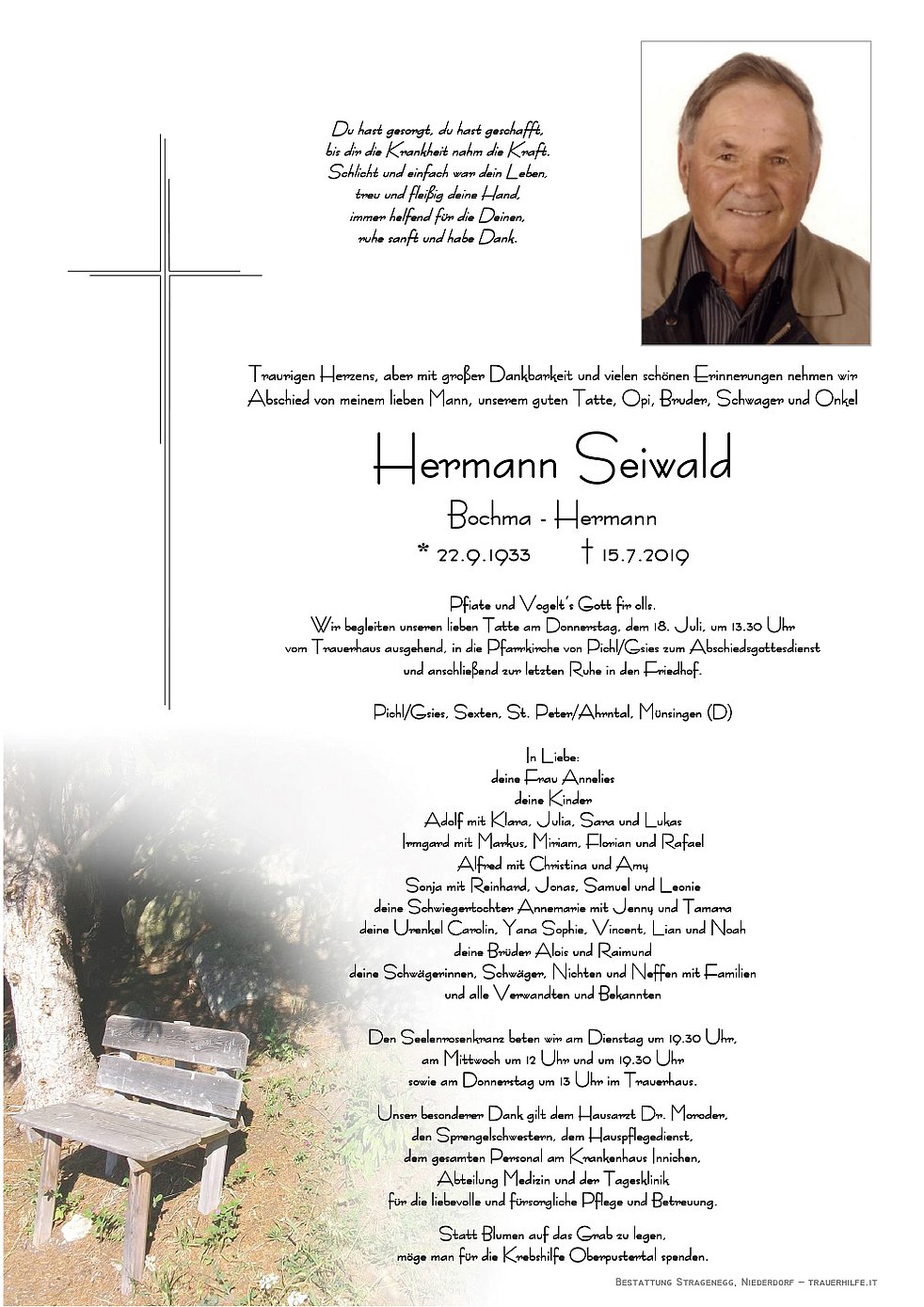 Wir begleiten unseren lieben Tatte am Donnerstag, dem 18. Juli, um 13.30 Uhr vom Trauerhaus ausgehend, in die Pfarrkirche von Pichl/Gsies zum Abschiedsgottesdienst und anschließend zur letzten Ruhe in den Friedhof.