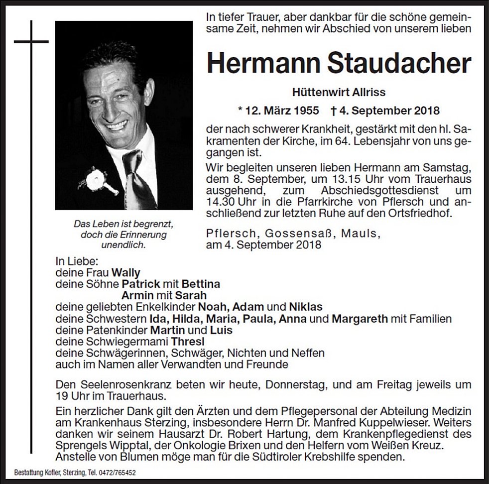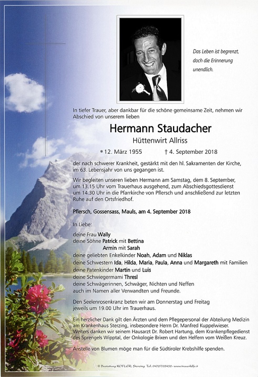 Wir begleiten unseren lieben Hermann am Samstag, dem 8. September, um 13.15 Uhr vom Trauerhaus ausgehend, zum Abschiedsgottesdienst um 14.30 Uhr in die Pfarrkirche von Pflersch und anschließend zur letzten Ruhe auf den Ortsfriedhof.