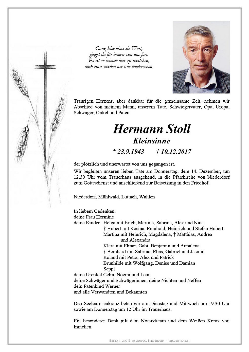 Wir begleiten unseren lieben Tate am Donnerstag, dem 14. Dezember, um 12.30 Uhr vom Trauerhaus ausgehend, in die Pfarrkirche von Niederdorf zum Gottesdienst und anschließend zur Beisetzung in den Friedhof.