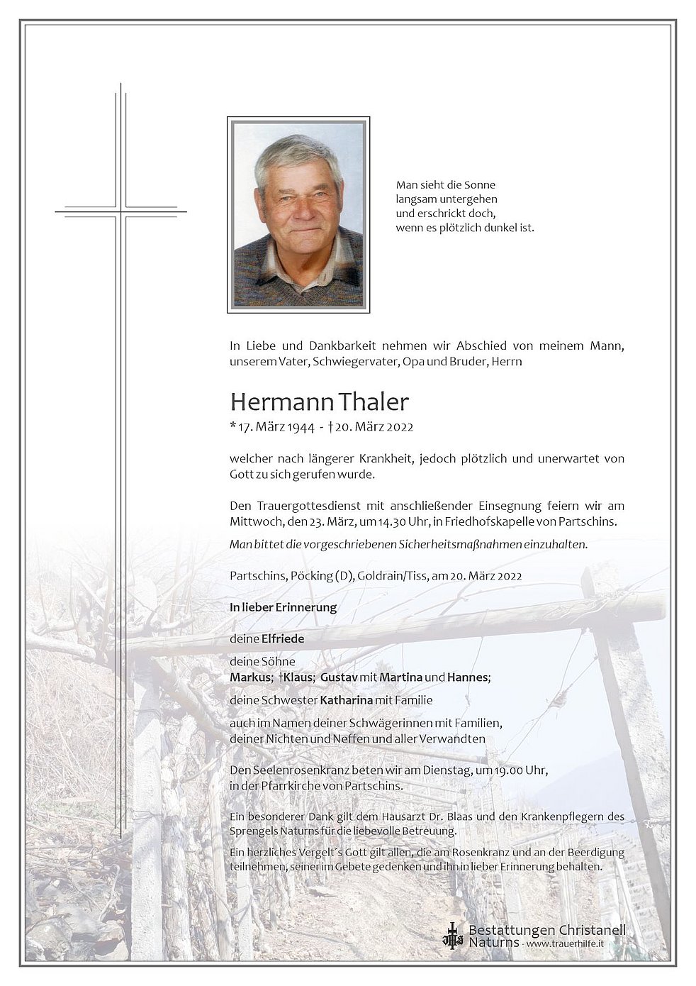 Den Trauergottesdienst mit anschließender Einsegnung feiern wir am Mittwoch, den 23. März, um 14.30 Uhr, in Friedhofskapelle von Partschins.