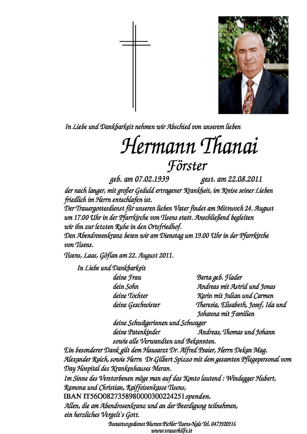 In Liebe und Dankbarkeit nehmen wir Abschied von unserem lieben Hermann Thanai Förster der nach langer, mit großer Geduld ertragener Krankheit, im Kreise seiner Lieben friedlich im Herrn entschlafen ist. Der Trauergottesdienst für unseren lieben Vater findet am Mittwoch 24. August um 17.00 Uhr in der Pfarrkirche von Tisens statt. Anschließend begleiten wir ihn zur letzten Ruhe in den Ortsfriedhof. Den Abendrosenkranz beten wir am Dienstag um 19.00 Uhr in der Pfarrkirche von Tisens. Tisens, Laas, Göflan am 22. August 2011. In Liebe und Dankbarkeit deine Frau Berta geb. Flader dein Sohn Andreas mit Astrid und Jonas deine Tochter Karin mit Julian und Carmen deine Geschwister Theresia, Elisabeth, Josef, Ida und Johanna mit Familien deine Schwägerinnen und Schwager deine Patenkinder Andreas, Thomas und Johann sowie alle Verwandten und Bekannten. Ein besonderer Dank gilt dem Hausarzt Dr. Alfred Psaier, Herrn Dekan Mag. Alexander Raich, sowie Herrn Dr.Gilbert Spizzo mit dem gesamten Pflegepersonal vom Day Hospital des Krankenhauses Meran. Im Sinne des Verstorbenen möge man auf das Konto lautend : Windegger Hubert, Ramona und Christian, Raiffeisenkasse Tisens, IBAN IT56O0827358980000300224251spenden. Allen, die am Abendrosenkranz und an der Beerdigung teilnehmen, ein herzliches Vergelt`s Gott.