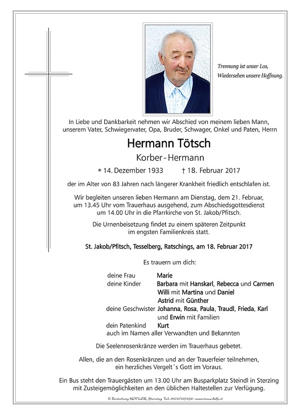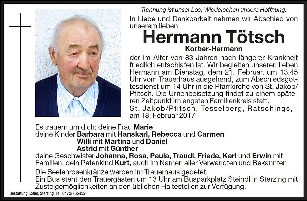Wir begleiten unseren lieben Hermann am Dienstag, dem 21. Februar, um 13.45 Uhr vom Trauerhaus ausgehend, zum Abschiedsgottesdienst um 14.00 Uhr in die Pfarrkirche von St. Jakob/Pfitsch.