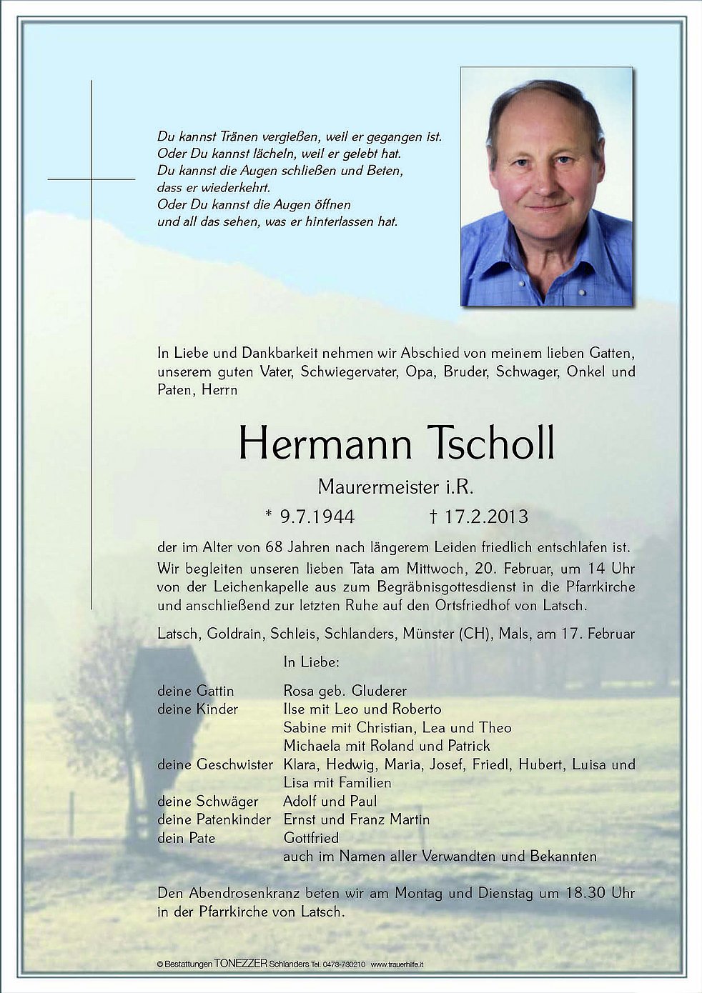 Wir begleiten unseren lieben Tata am Mittwoch, 20. Februar, um 14 Uhr von der Leichenkapelle aus zum Begräbnisgottesdienst in die Pfarrkirche und anschließend zur letzten Ruhe auf den Ortsfriedhof von Latsch.