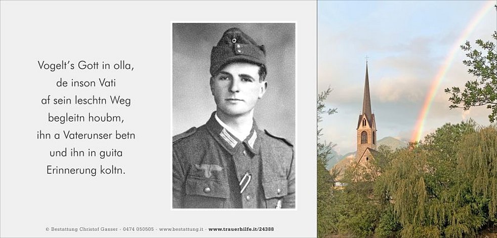 Mit 18 Jahren zog er in den Krieg ein und kämpfte an der Front. Trotz schwerster Verletzungen schaffte es Hermann nach Kufstein zu seiner Schwester und von dort aus mit dem Fahrrad nach Stegen.