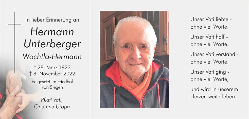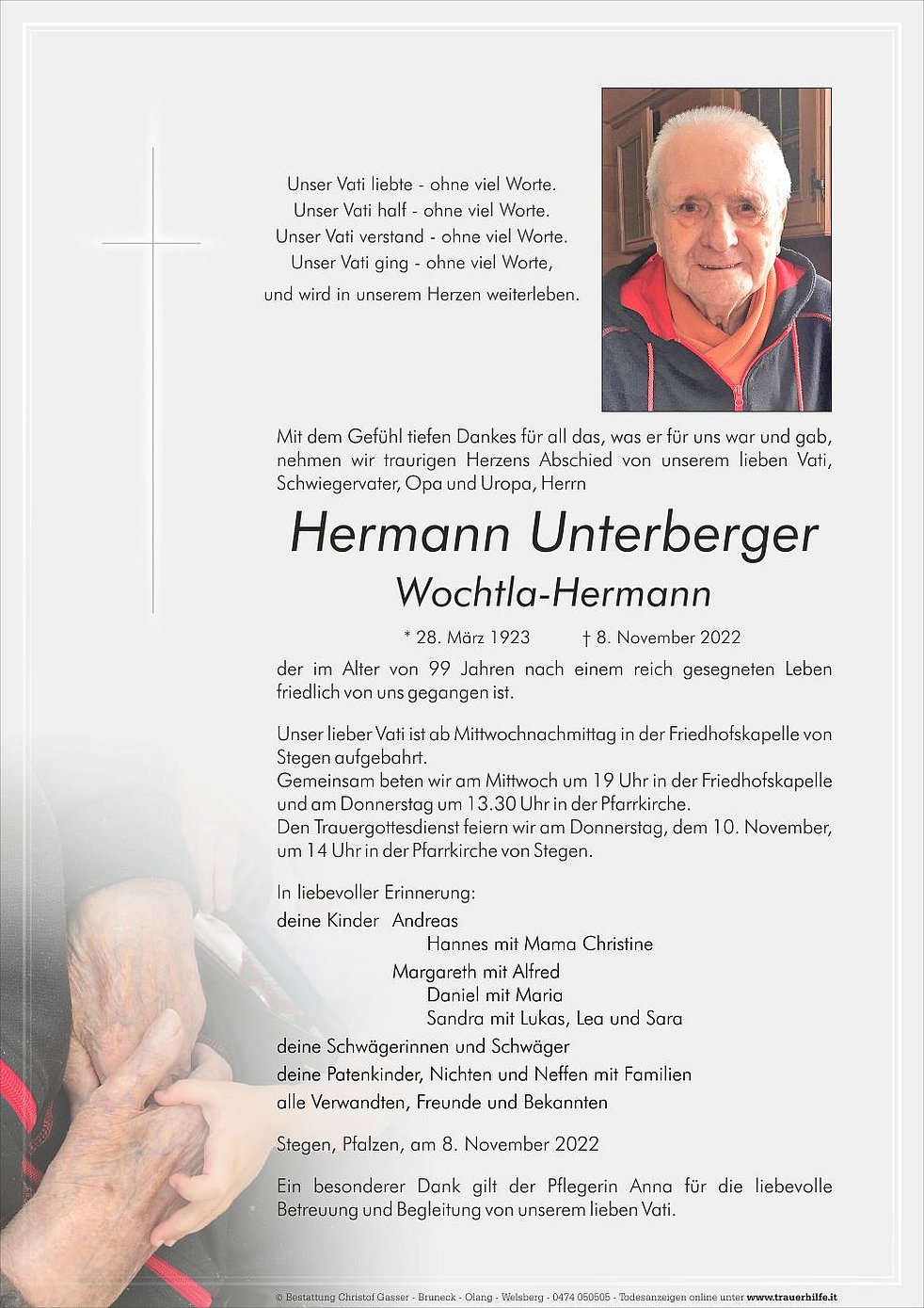 Hermann wurde 1923 als jüngstes von 12 Kindern beim Wochtla in Stegen geboren und verbrachte in der Großfamilie seine Kindheit.