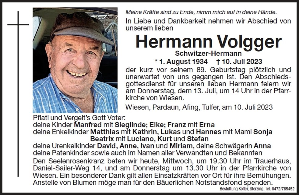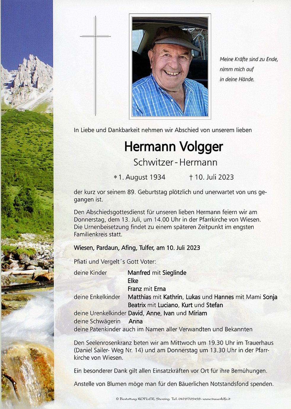Den Abschiedsgottesdienst für unseren lieben Hermann feiern wir am Donnerstag, dem 13. Juli, um 14.00 Uhr in der Pfarrkirche von Wiesen. Die Urnenbeisetzung findet zu einem späteren Zeitpunkt im engsten Familienkreis statt.