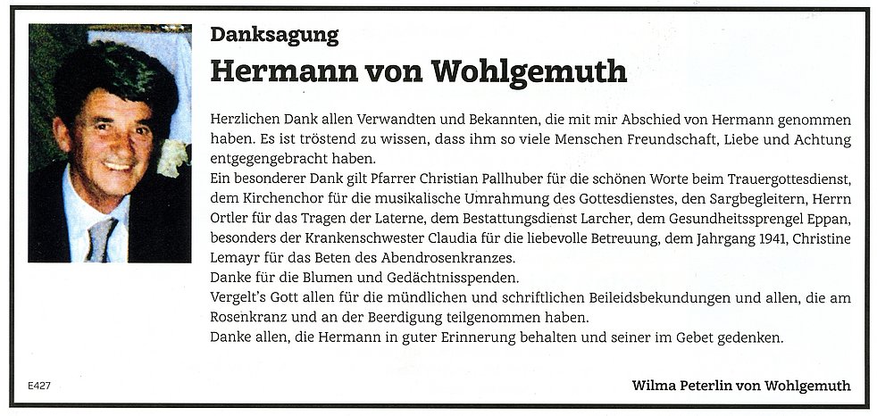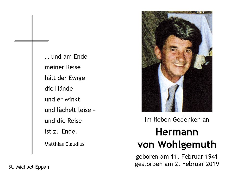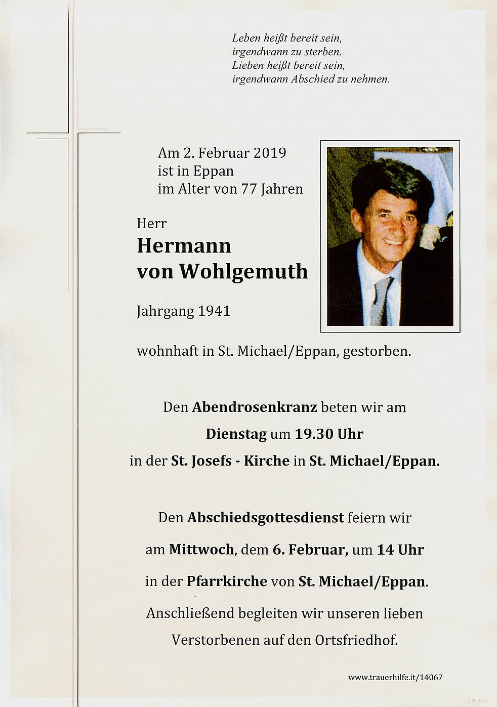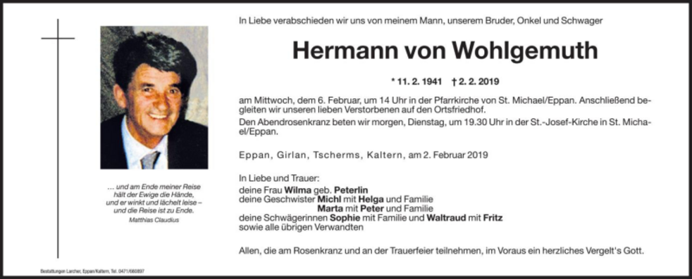 am Mittwoch, dem 6. Februar um 14 Uhr in der Pfarrkirche von St. Michael/Eppan. Anschließend begleiten wir unseren lieben Verstorbenen auf den Ortsfriedhof.