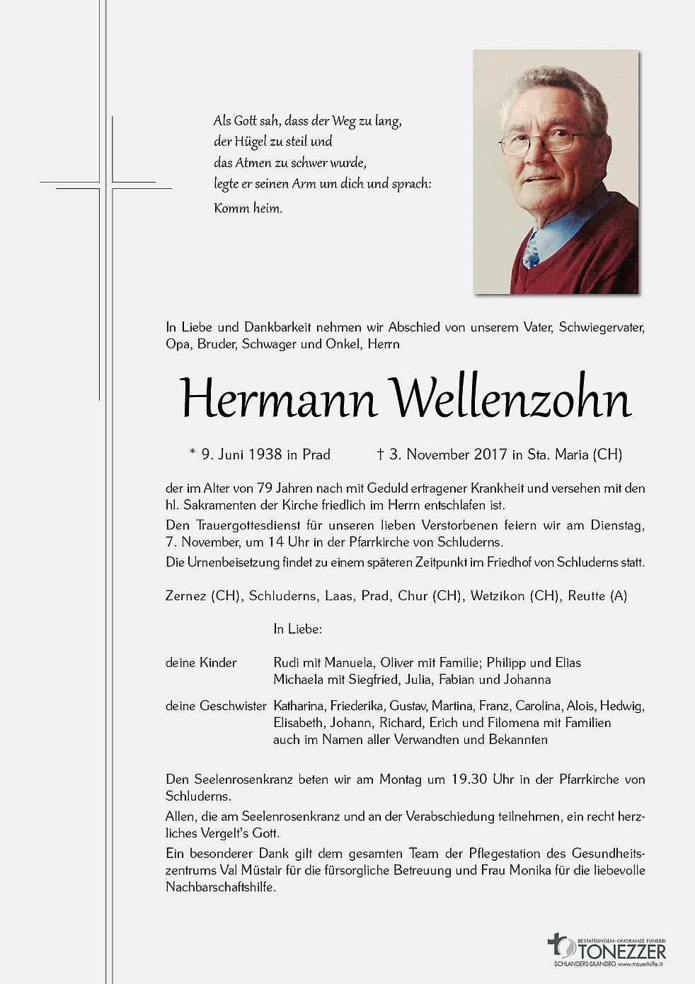 Den Trauergottesdienst für unseren lieben Verstorbenen feiern wir am Dienstag, 7. November, um 14 Uhr in der Pfarrkirche von Schluderns.
